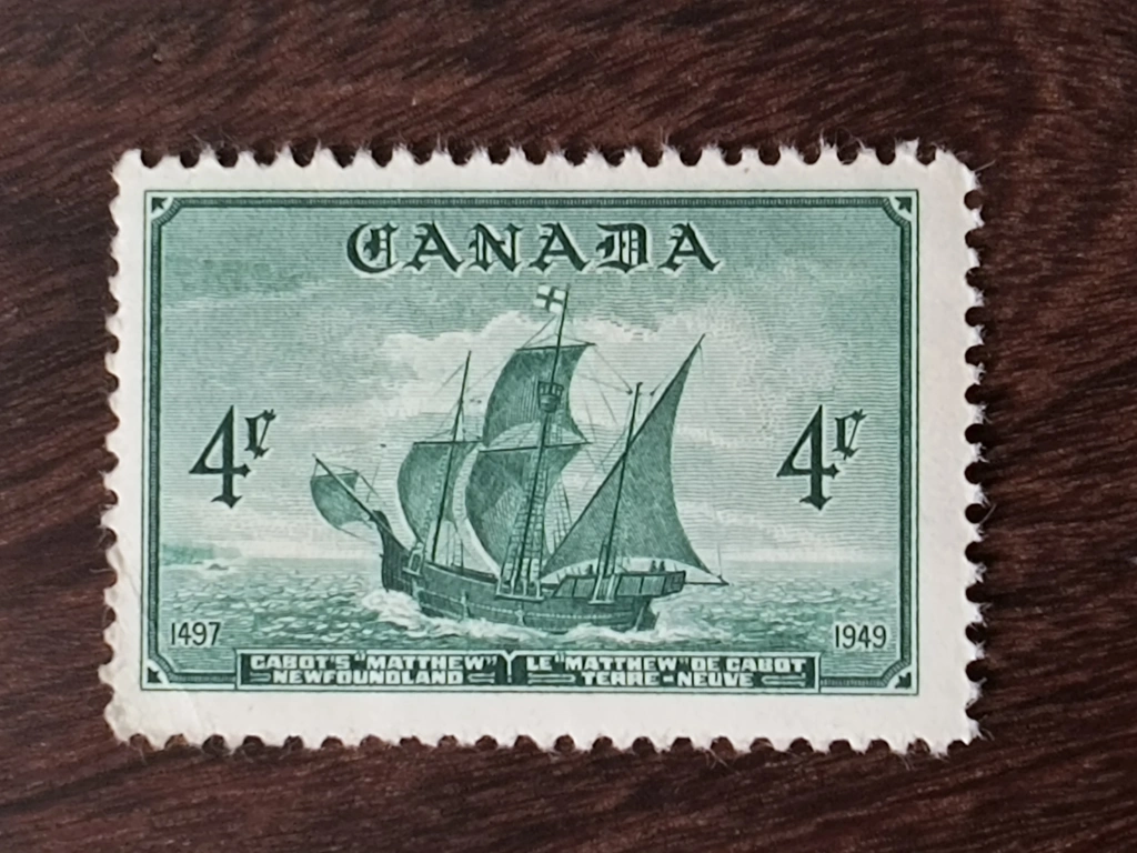 unused, Vintage Canadian stamp featuring a ship. Issued in 1949 to commemorate the 400th anniversary of John Cabot's voyage to Newfoundland.