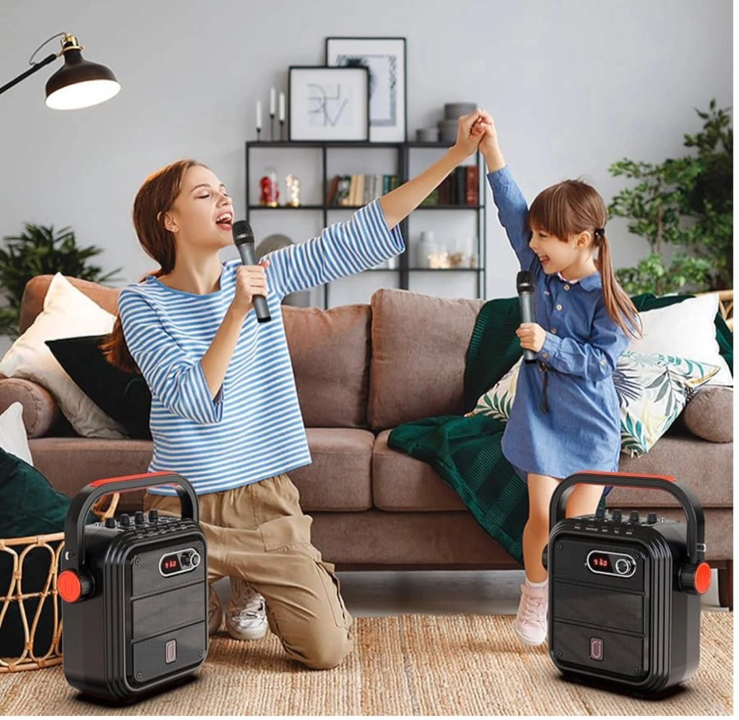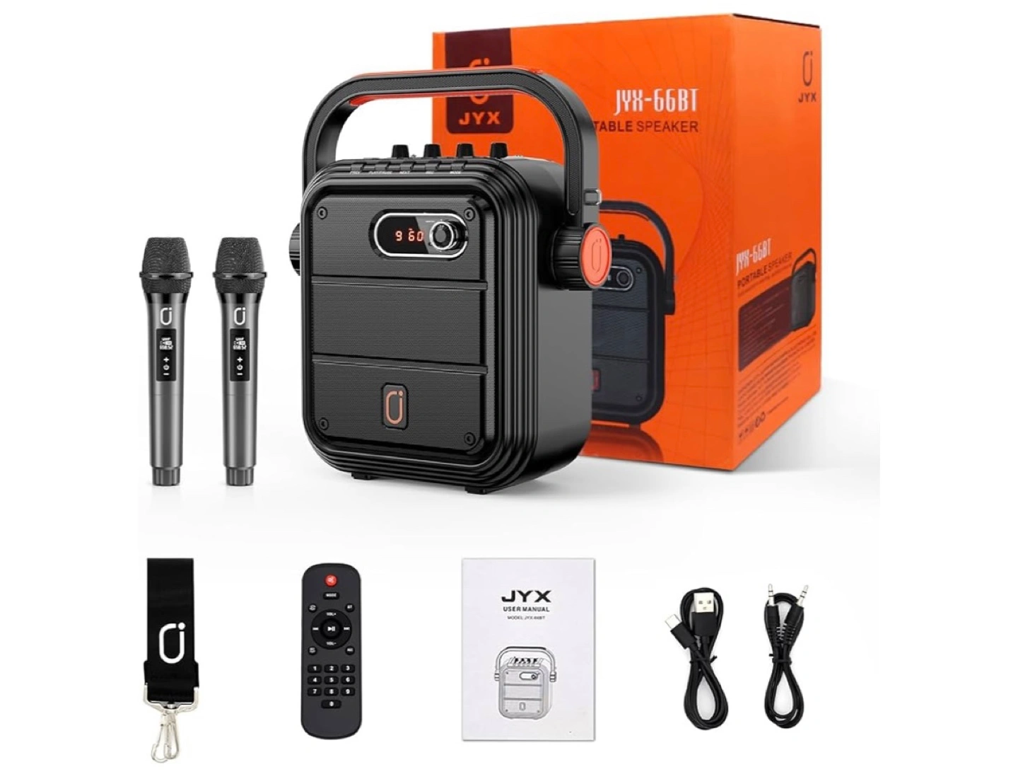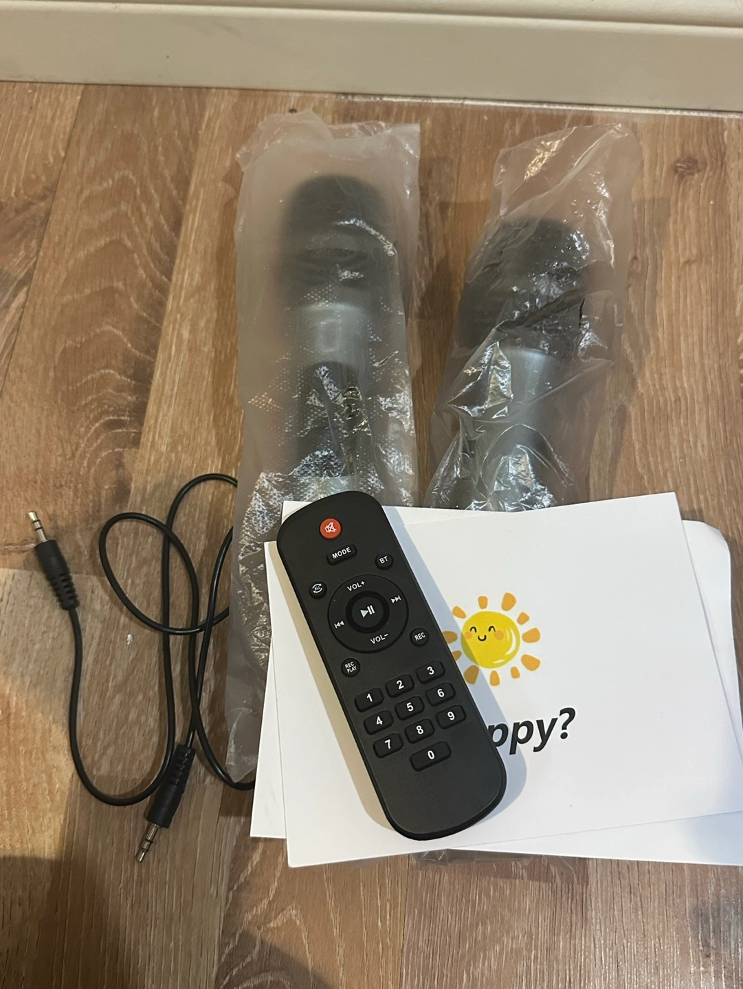 Portable karaoke speaker with two microphones, remote control, USB and SD card slots, AUX input, and a built-in rechargeable battery. Includes carrying strap, power cord, and audio cable.