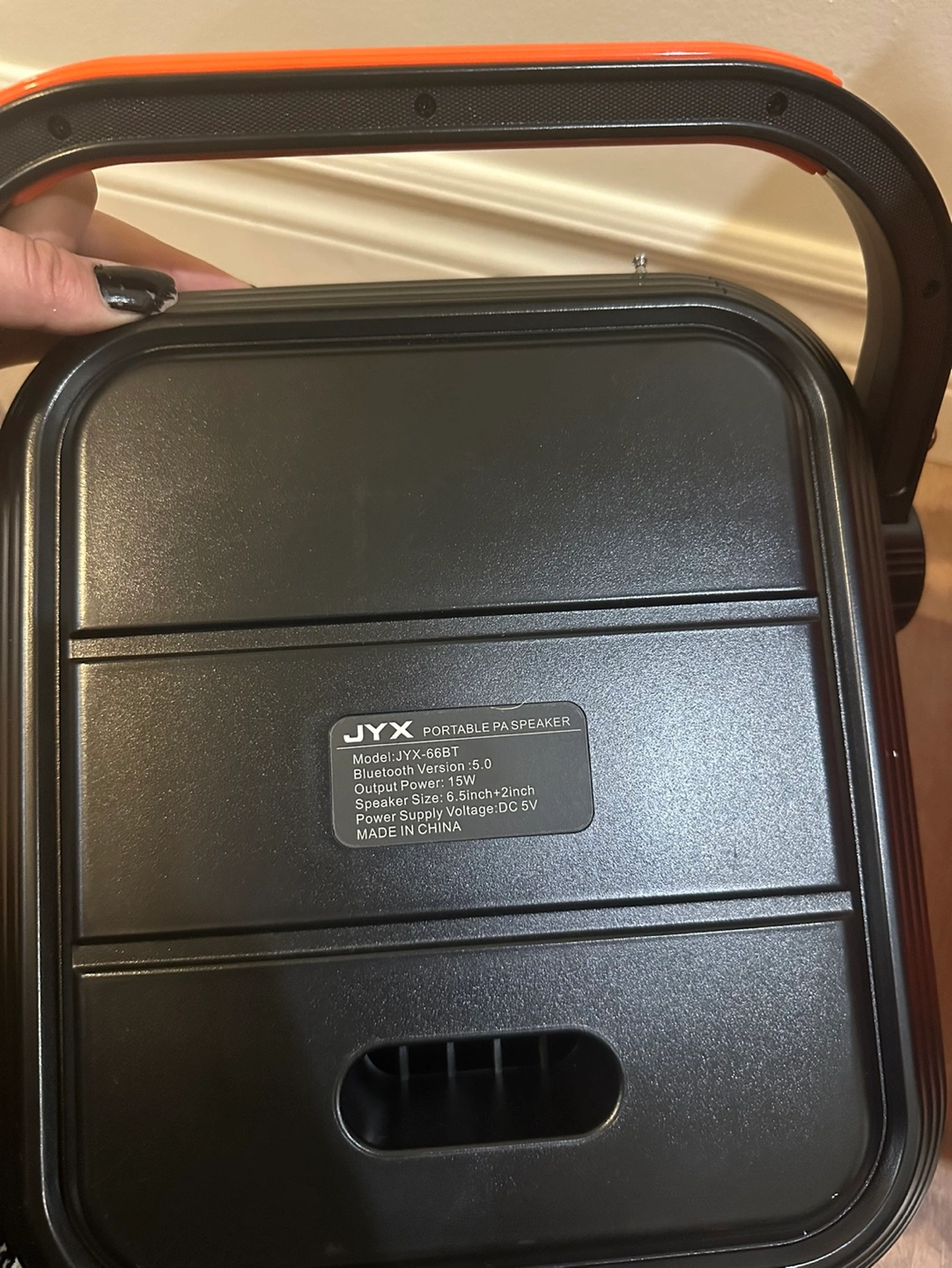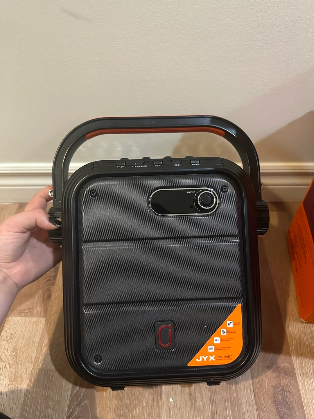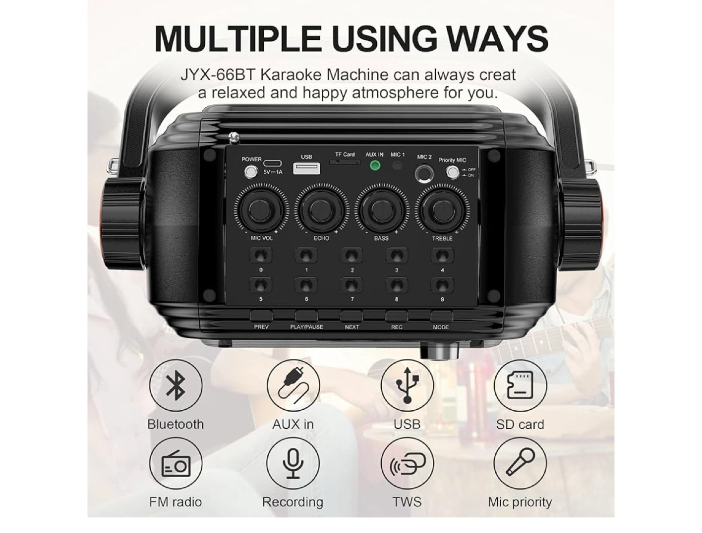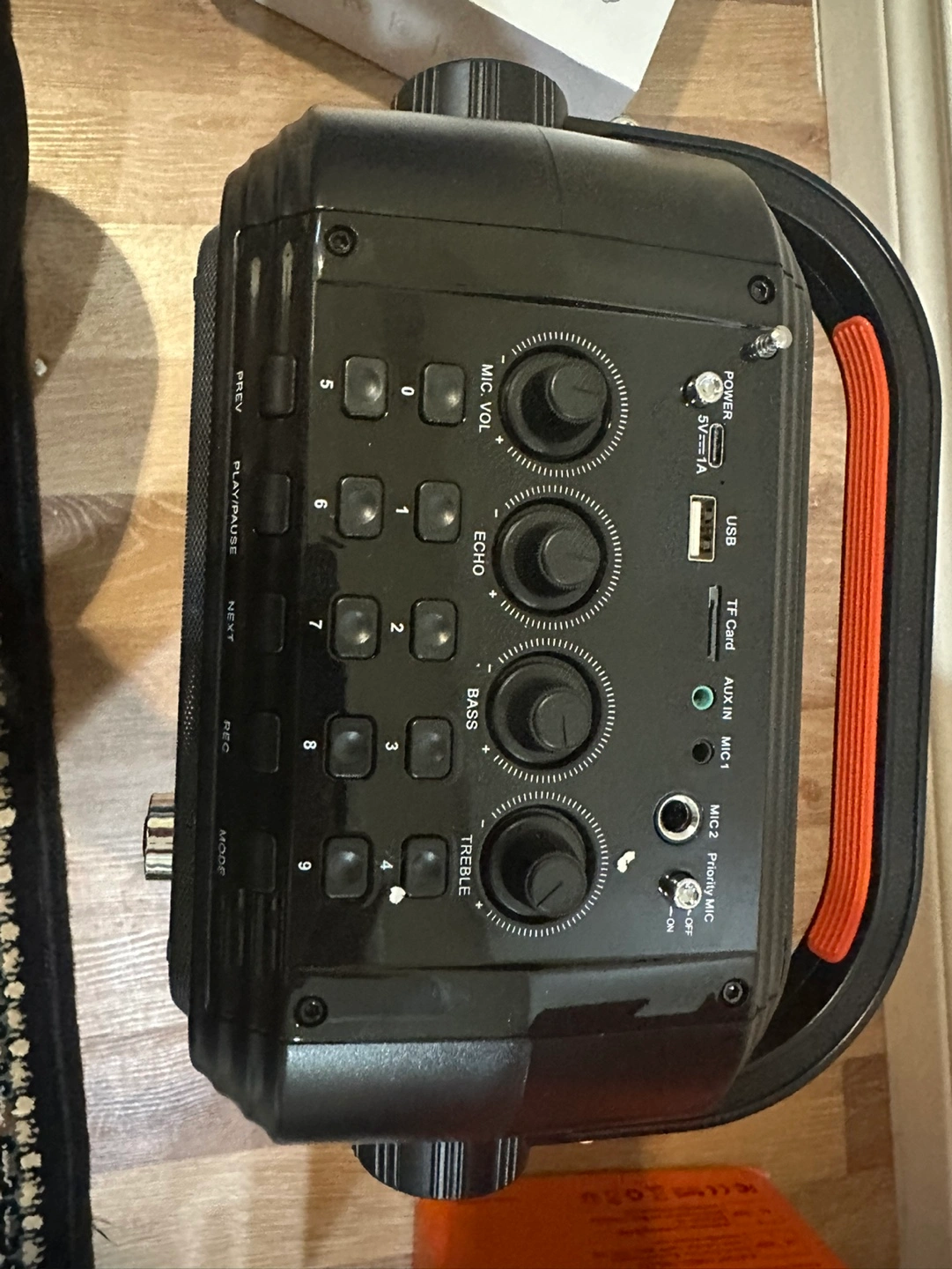 Portable karaoke speaker with two microphones, remote control, USB and SD card slots, AUX input, and a built-in rechargeable battery. Includes carrying strap, power cord, and audio cable.