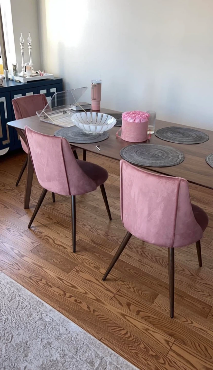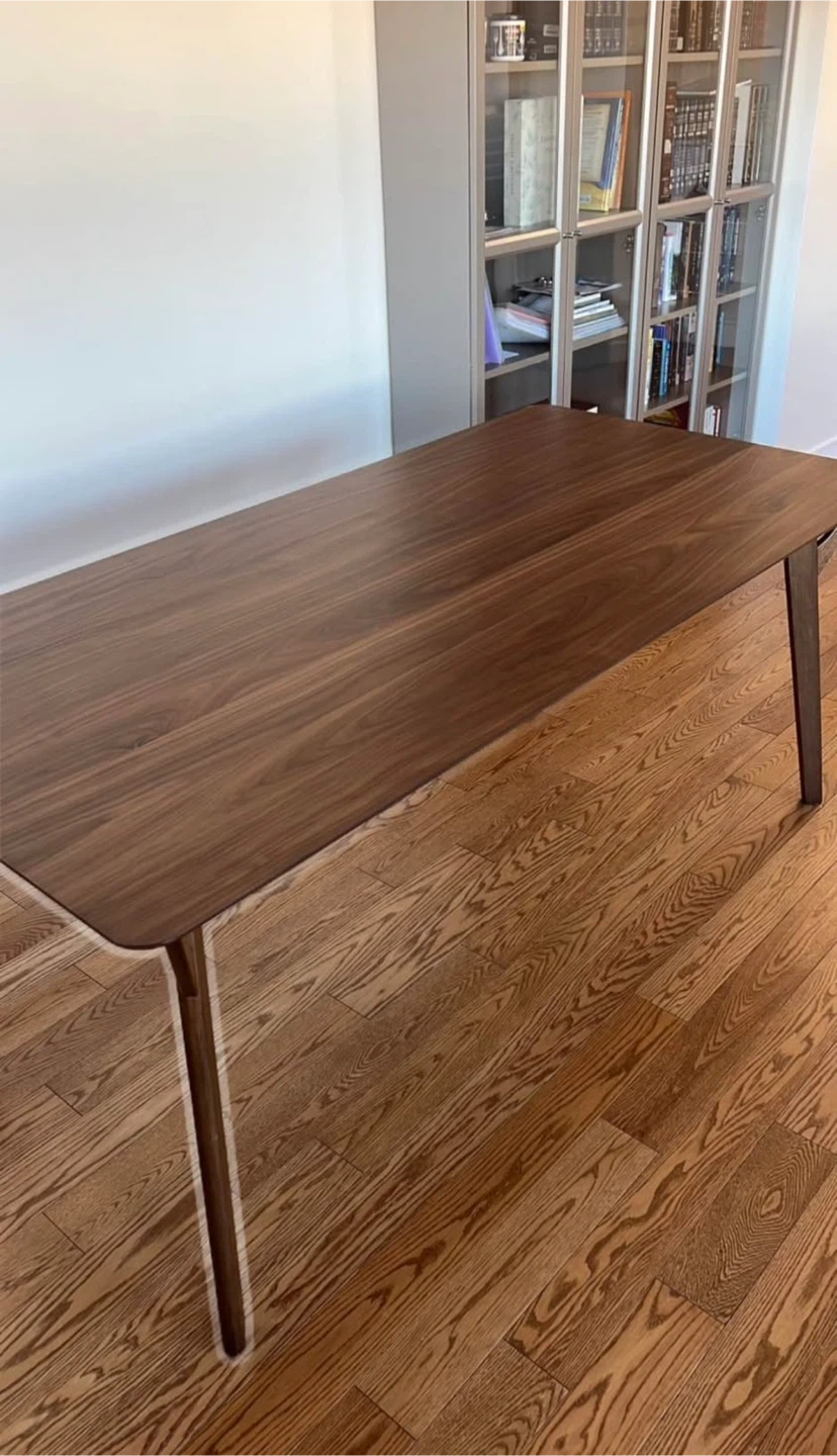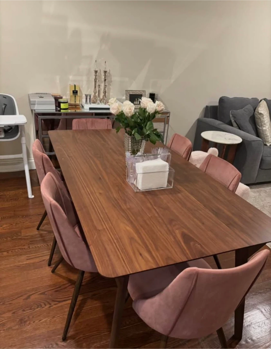 This dining table measures 71 inches long by 36 inches wide and stands 30 inches tall. It's crafted from solid wood with a warm finish. Seats up to 6 people comfortably.