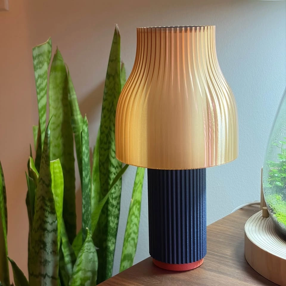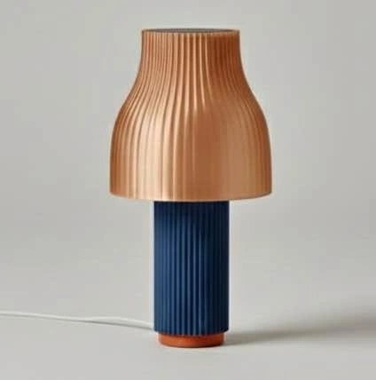 Blue modern table lamp with ribbed design.