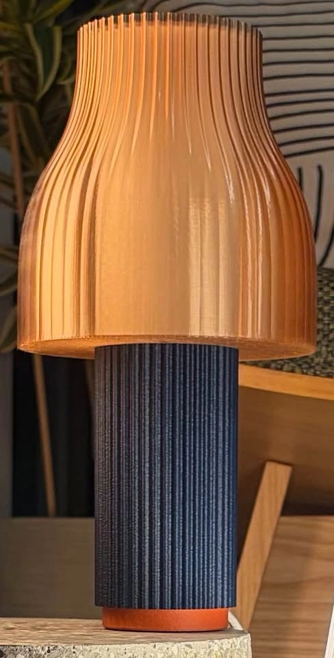 Blue modern table lamp with ribbed design.