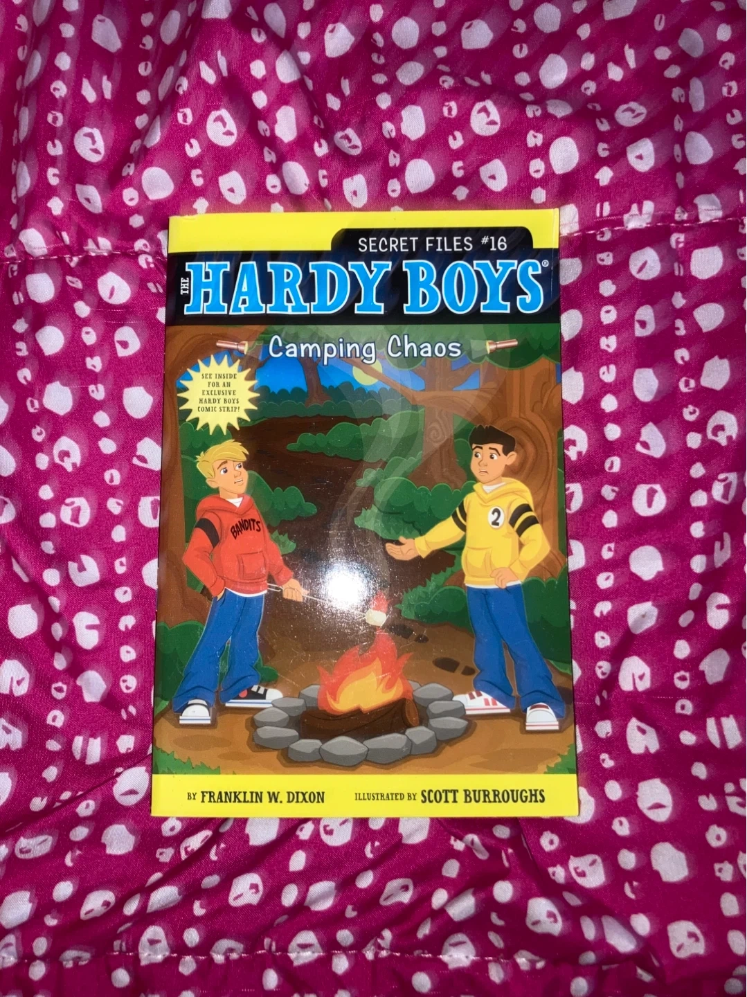 This is The Hardy Boys book "Camping Chaos", number 16 in the Secret Files series. It's written by Franklin W. Dixon and illustrated by Scott Burroughs. Included inside is an exclusive Hardy Boys comic strip!