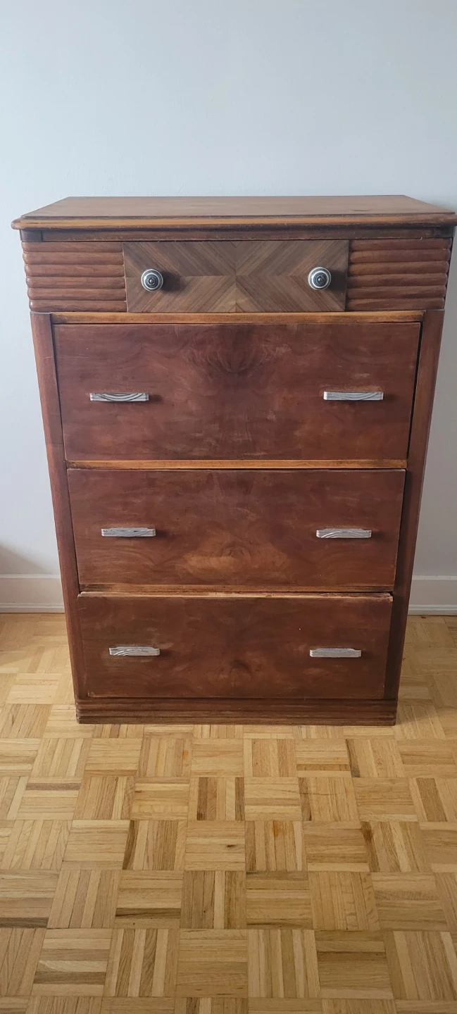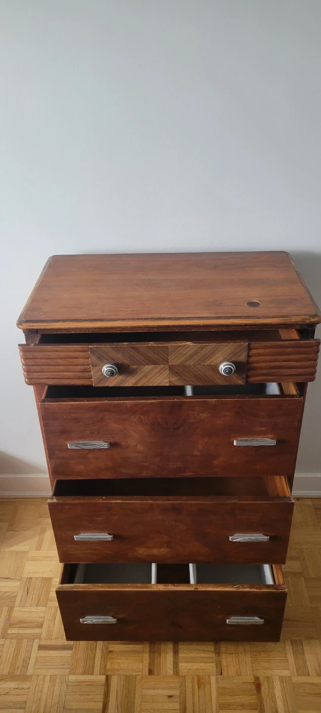 This vintage dresser is made of wood with a rich brown finish. It's a great piece for bedroom storage.
