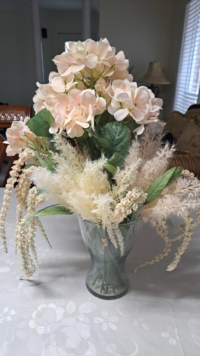 Beautiful faux hydrangea bouquet featuring light pink and cream blooms with greenery and delicate filler flowers. It's arranged in a clear glass vase. Adds a lovely touch to any room!