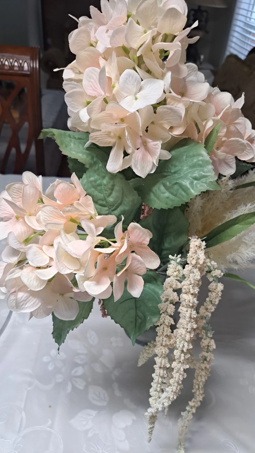 Beautiful faux hydrangea bouquet featuring light pink and cream blooms with greenery and delicate filler flowers. It's arranged in a clear glass vase. Adds a lovely touch to any room!