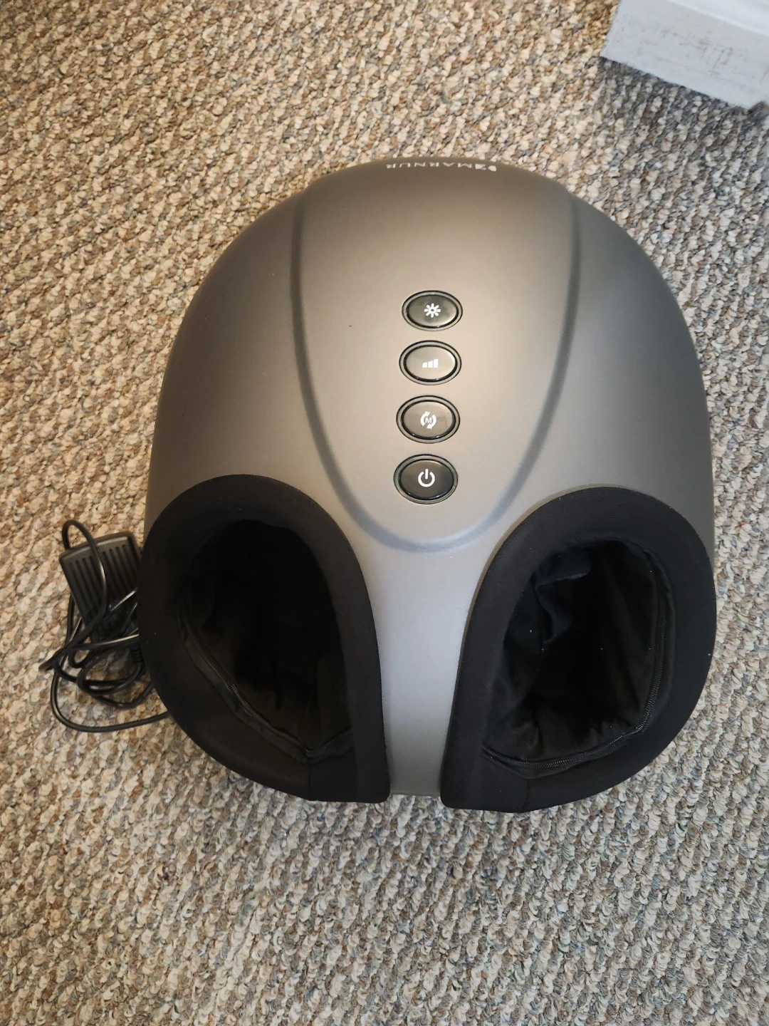 This Marnur Shiatsu Foot Massager offers kneading and heat functions for ultimate relaxation. It includes the massager, power cord, and original box. The model is MGF-50020A. This massager is great for unwinding after a long day!