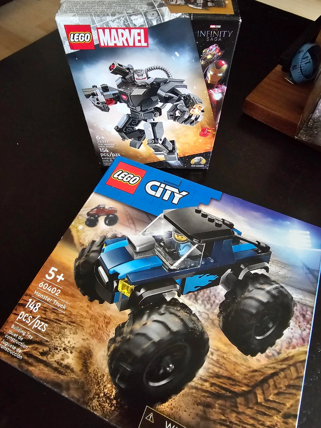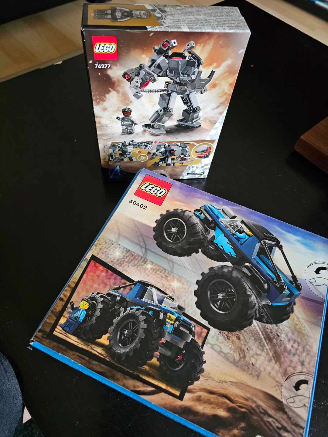 LEGO Marvel set 76277 featuring a mech and two minifigures, 156 pieces. LEGO City set 60402 Monster Truck with 148 pieces. Both are new and sealed in their original boxes.