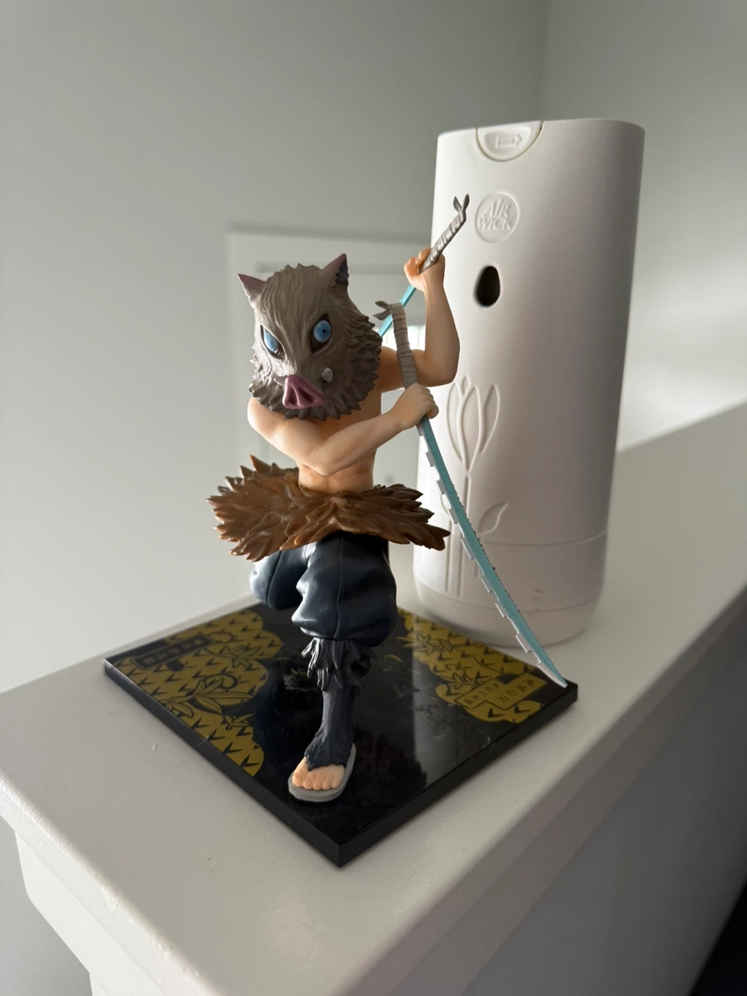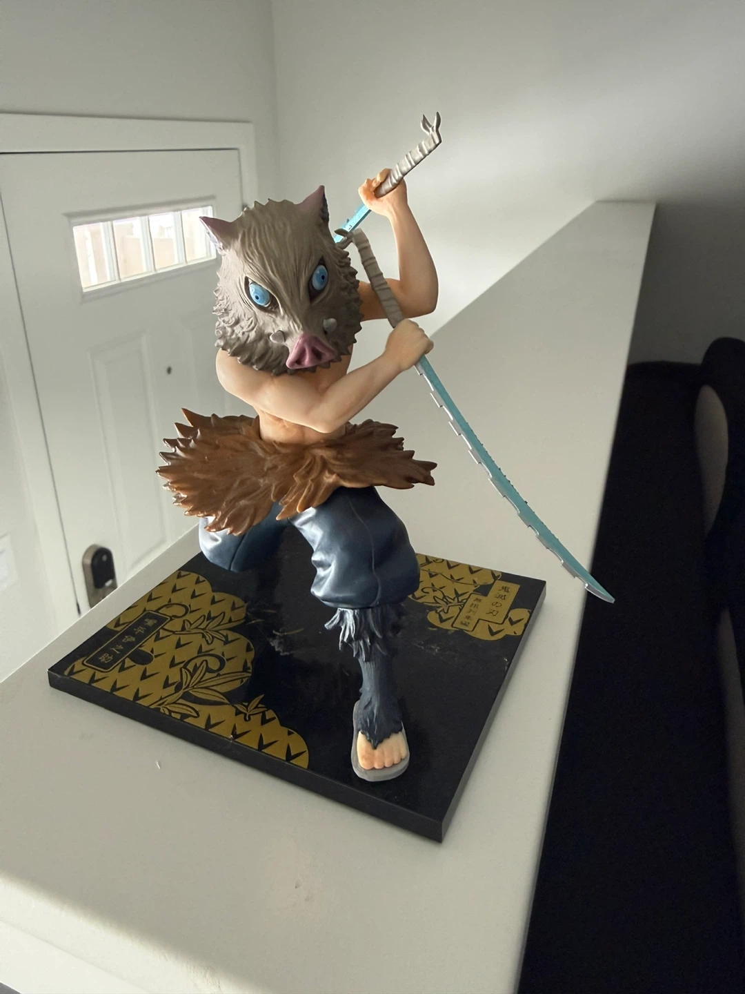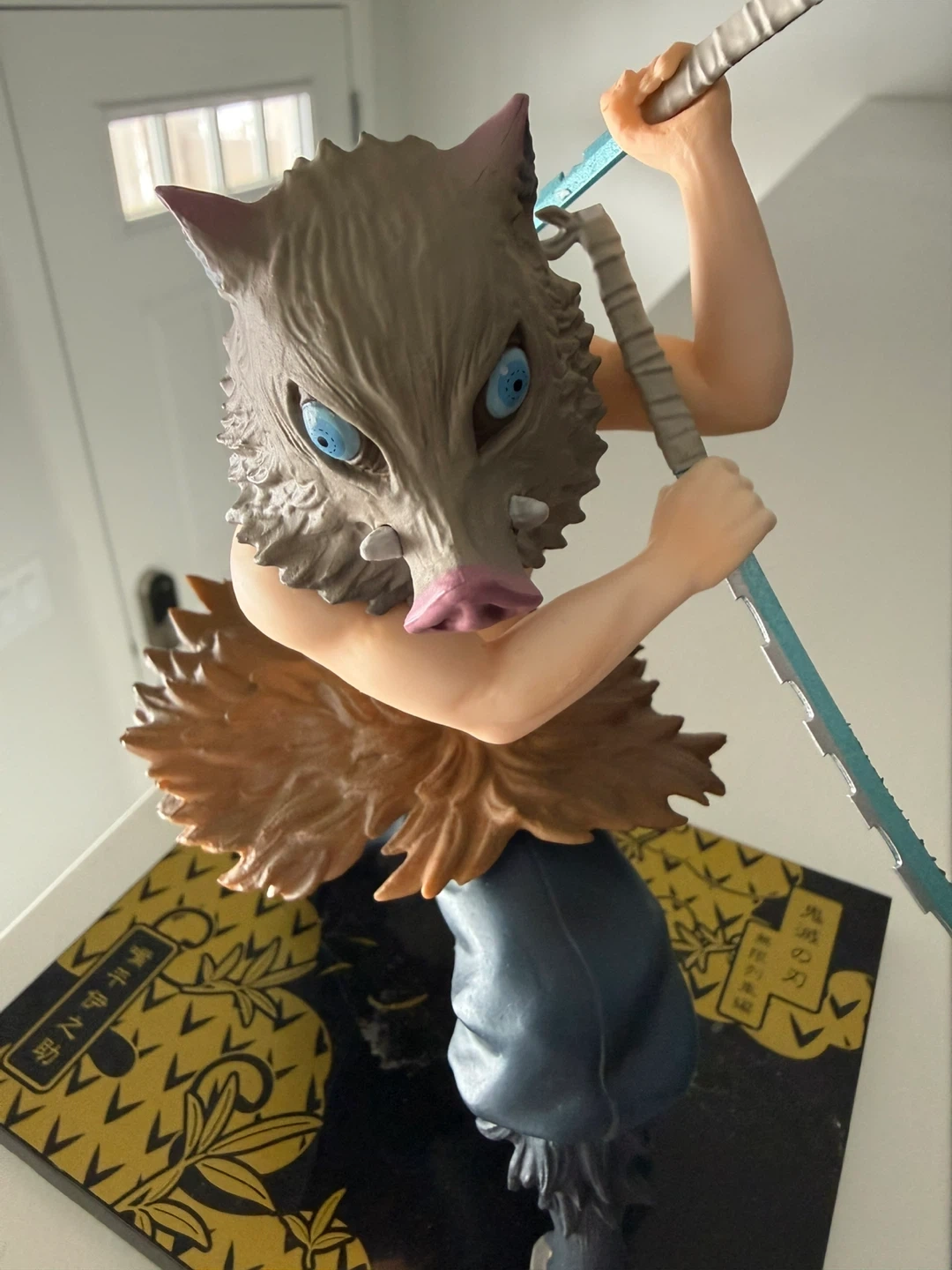 This is an Inosuke Hashibira figure from Demon Slayer. It's made of plastic and stands on a decorative base. This collectible is perfect for fans of the anime series.