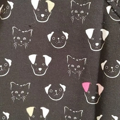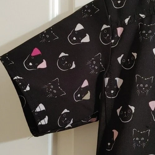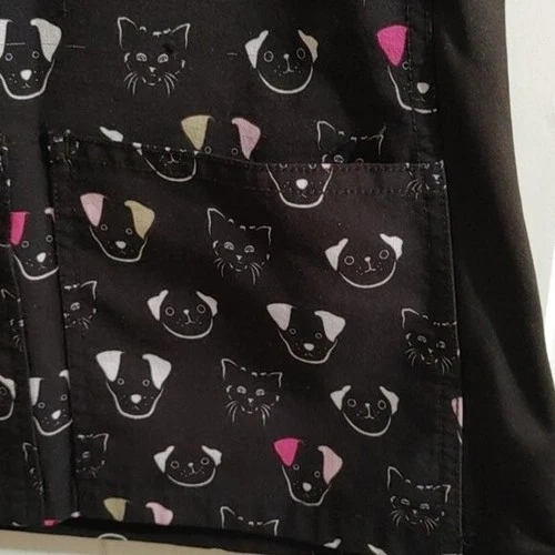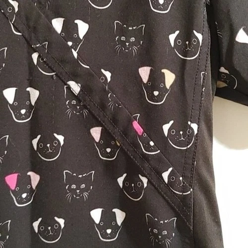 EUCXS X-small Scrubs top. Dogs and cats pattern. Black, pink, off white colors. Two large pockets. Side stretchy stripes. One pocket also had a small one and a pen one, with a clip for ID batch. 4 way stretch. Pit to pit 18 in