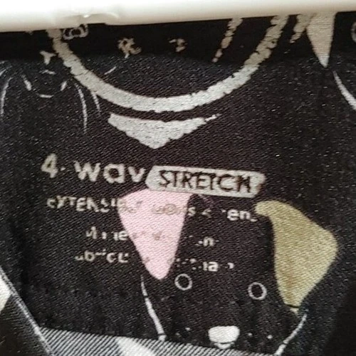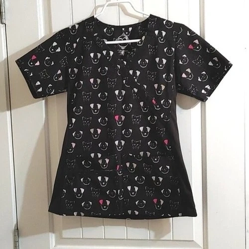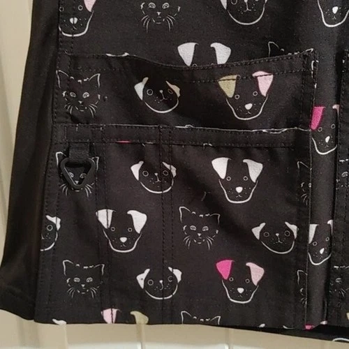 EUCXS X-small Scrubs top. Dogs and cats pattern. Black, pink, off white colors. Two large pockets. Side stretchy stripes. One pocket also had a small one and a pen one, with a clip for ID batch. 4 way stretch. Pit to pit 18 in
