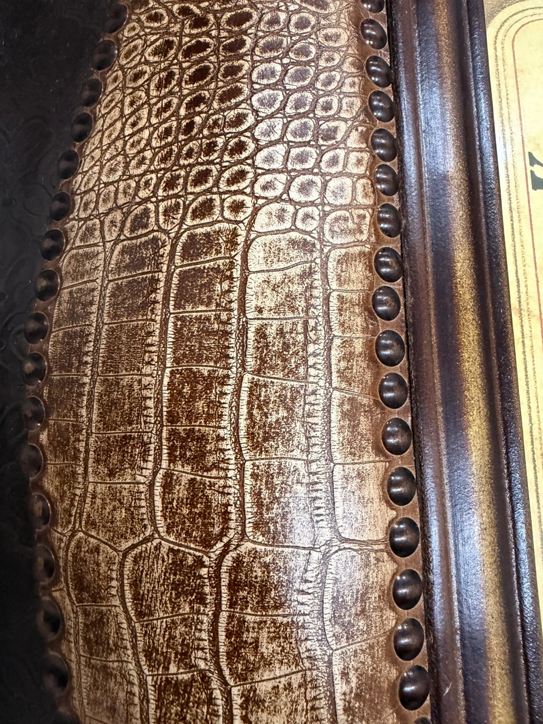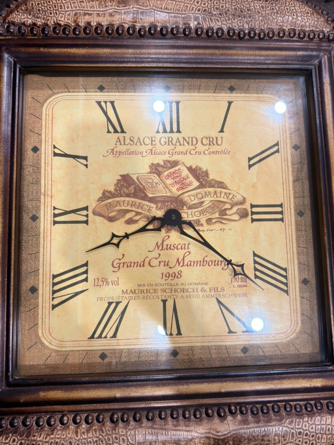 Decorative wall clock featuring an Alsace Grand Cru wine label design. It has a crocodile texture frame with decorative metal accents. The clock face shows Roman numerals and details about Muscat Grand Cru Mambourg 1998.