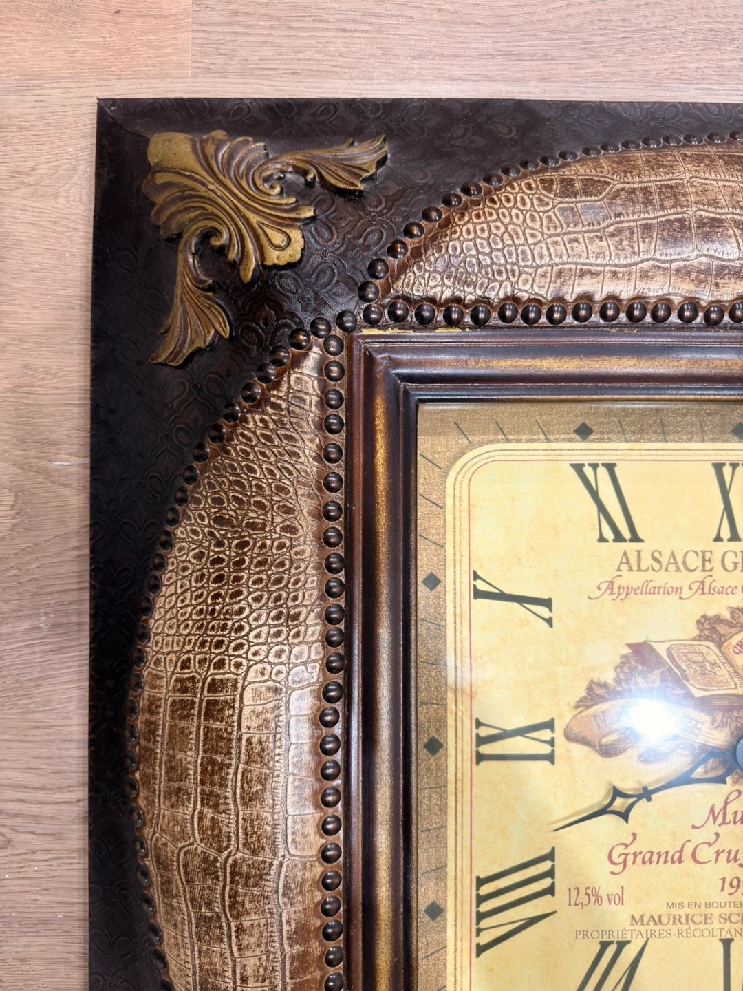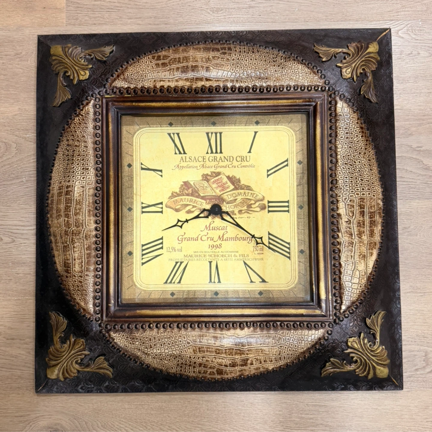Decorative wall clock featuring an Alsace Grand Cru wine label design. It has a crocodile texture frame with decorative metal accents. The clock face shows Roman numerals and details about Muscat Grand Cru Mambourg 1998.