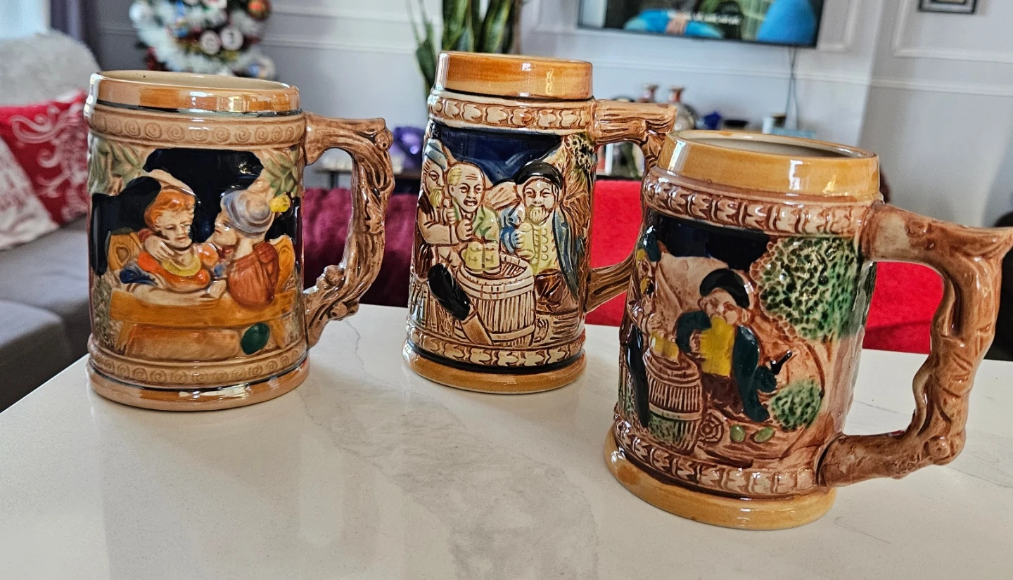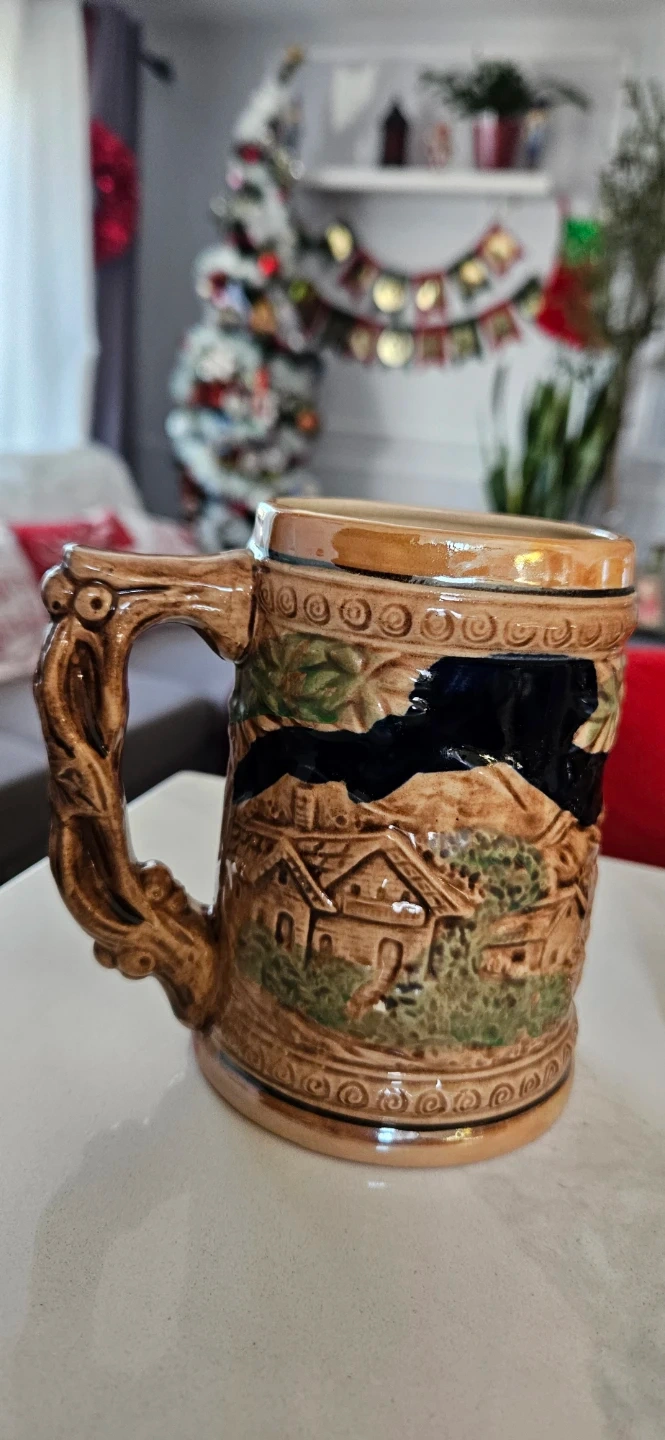 Selling a vintage decorative beer stein mug. It has a unique design with a detailed handle and scenes depicted on the body. Great for collectors or as a decorative piece for your home!