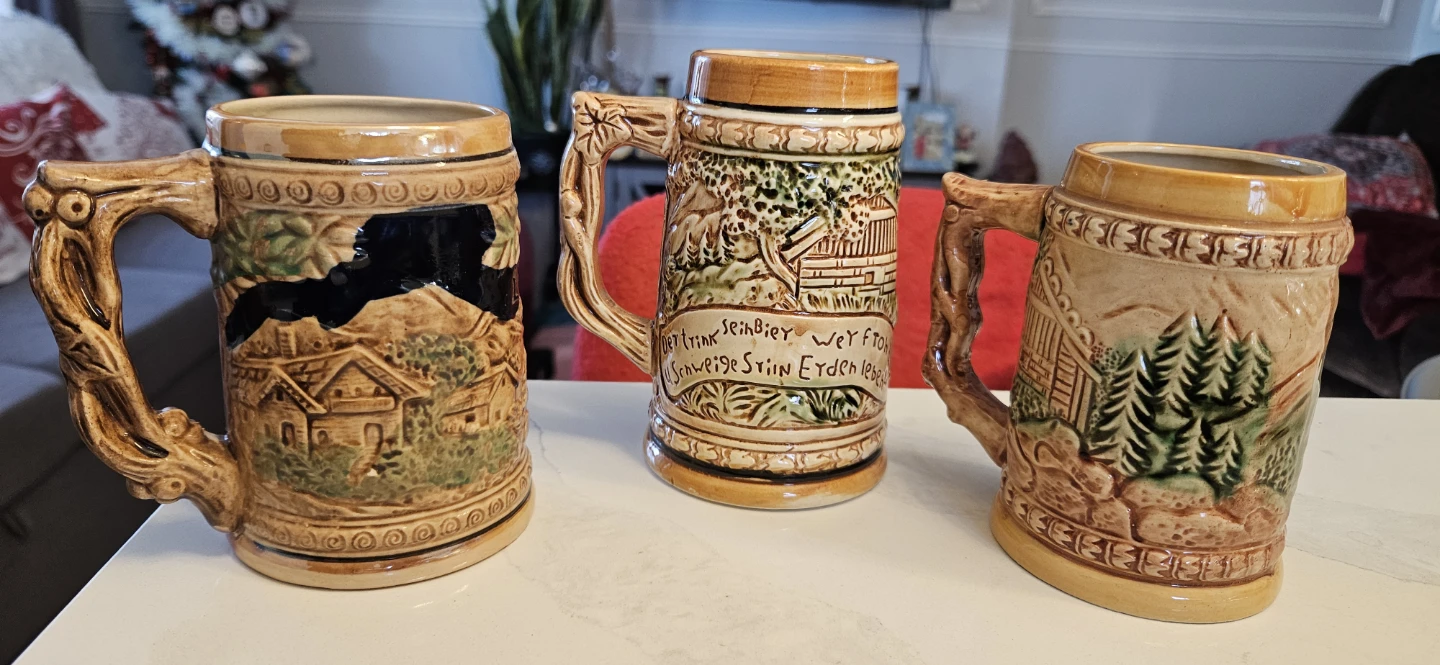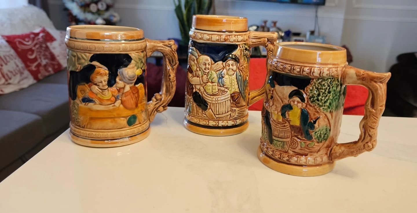 Selling a vintage decorative beer stein mug. It has a unique design with a detailed handle and scenes depicted on the body. Great for collectors or as a decorative piece for your home!