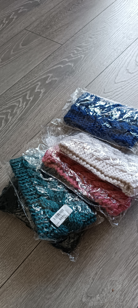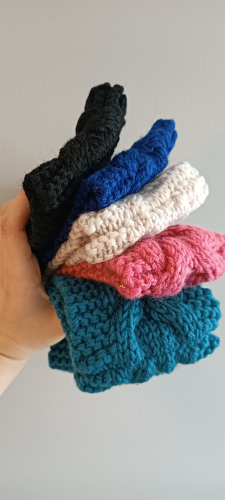 handmade knit headbands. Colours include pink, teal, navy blue, beige, and black. Soft and stretchy. Perfect for keeping hair out of your face.