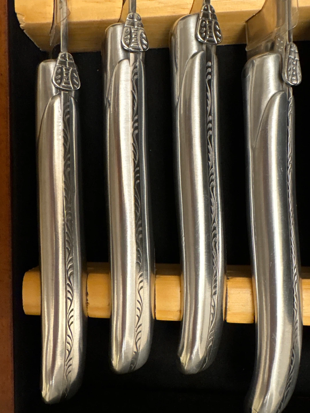 Elegant set of 8 steak knives with engraved stainless steel blades and handles. They come in a dark wood display box with a felt lining. These knives are perfect for any dinner party or special occasion!
