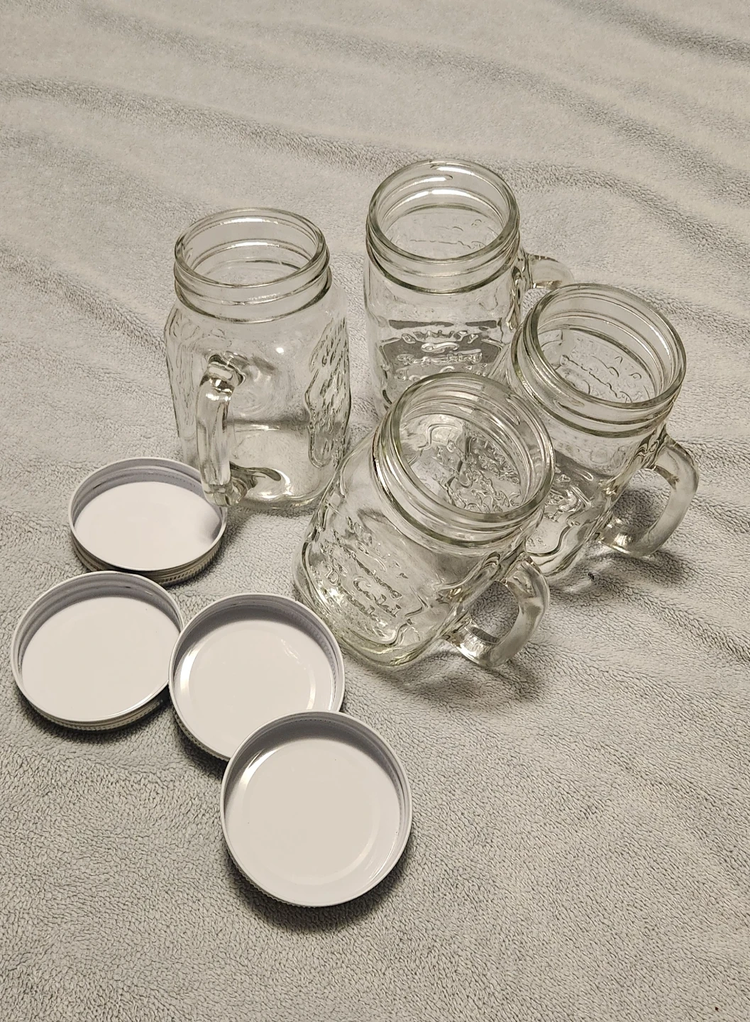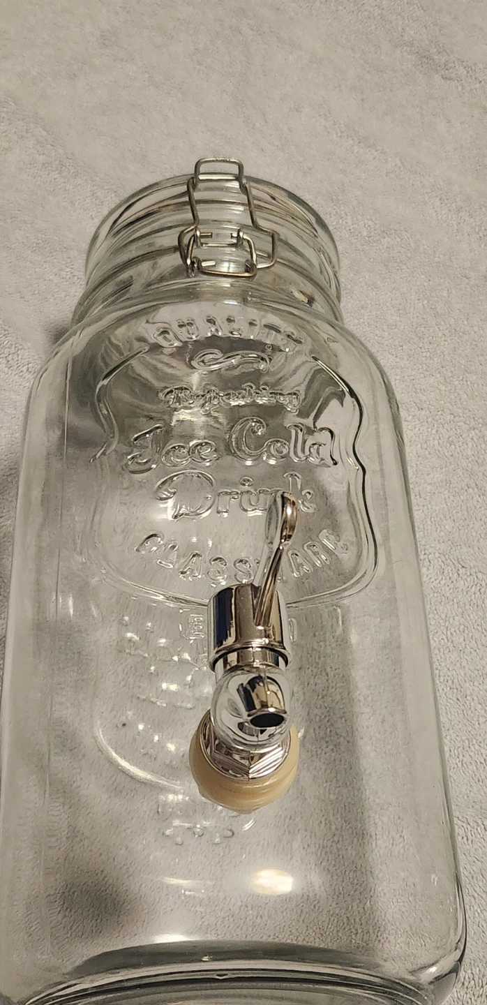 This set includes a large glass drink dispenser with a spigot holds 16 cups of beverage. Also has four matching mason jars mugs with lids. It's perfect for serving beverages at gatherings. No damage of any kind to lids, no crack or chips. Practically brand new.