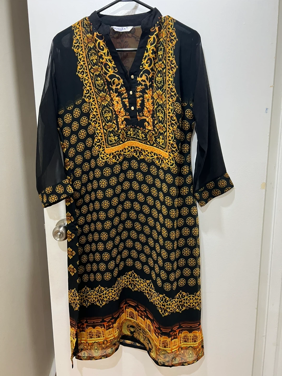 Ahuza kurti with a black base and intricate gold print. It has sheer sleeves and a v-neckline with button detailing. This stylish kurti is perfect for casual or semi-formal occasions.