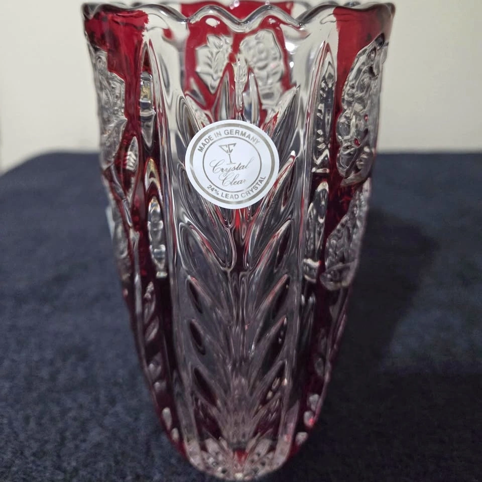 Beautiful high-quality German lead crystal vase featuring a deep ruby red overlay and classic cut-to-clear floral and geometric patterns. This style is inspired by traditional German and Bohemian crystal work, known for its weight, clarity, and brilliant sparkle. The vase still has its original label: “Made in Germany – Crystal Clear – 24% Lead Crystal.”