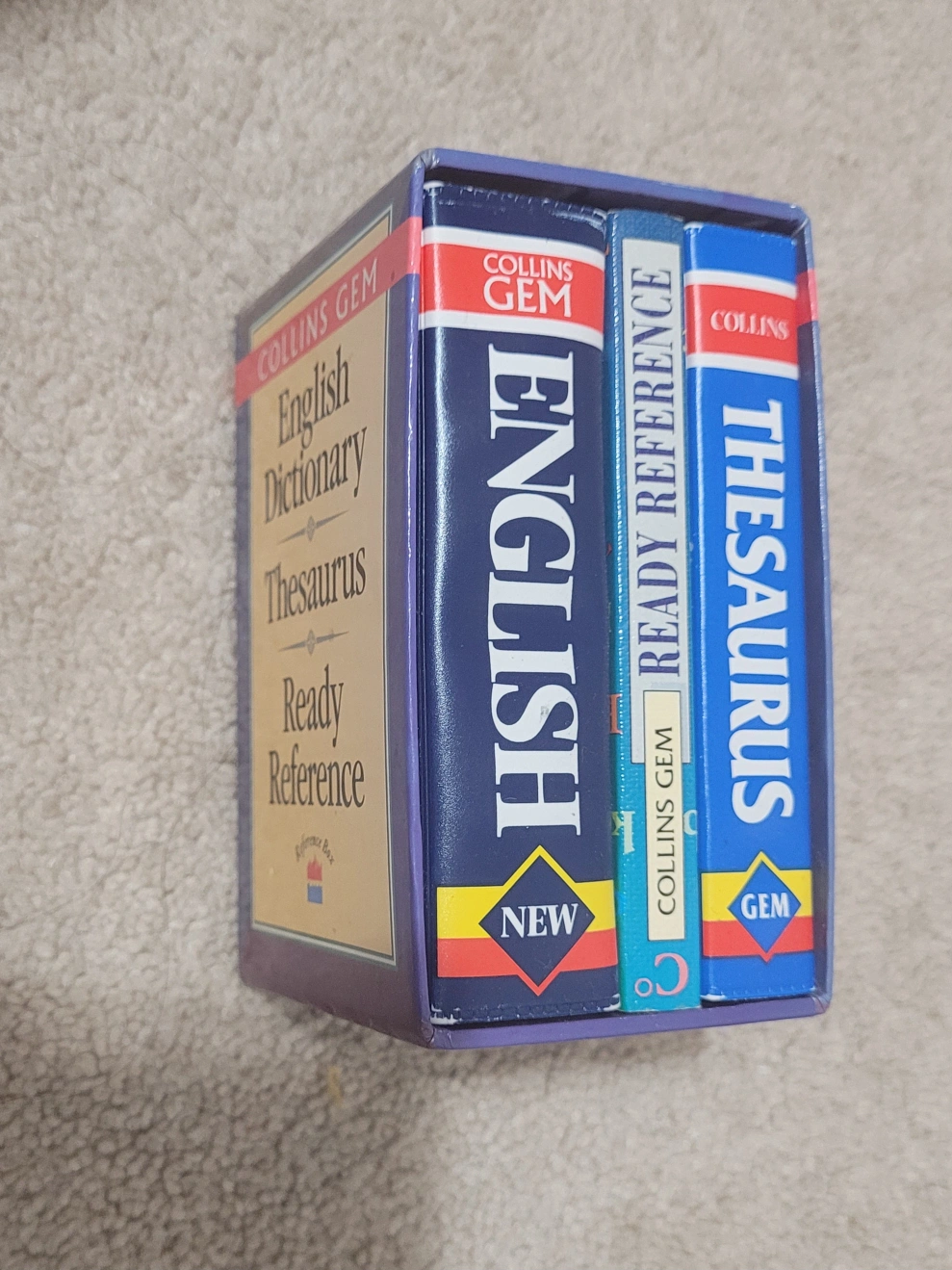 Selling a Collins Gem reference set! This includes the English Dictionary, Thesaurus, and Ready Reference guide. Perfect for students or anyone who loves having quick access to language tools