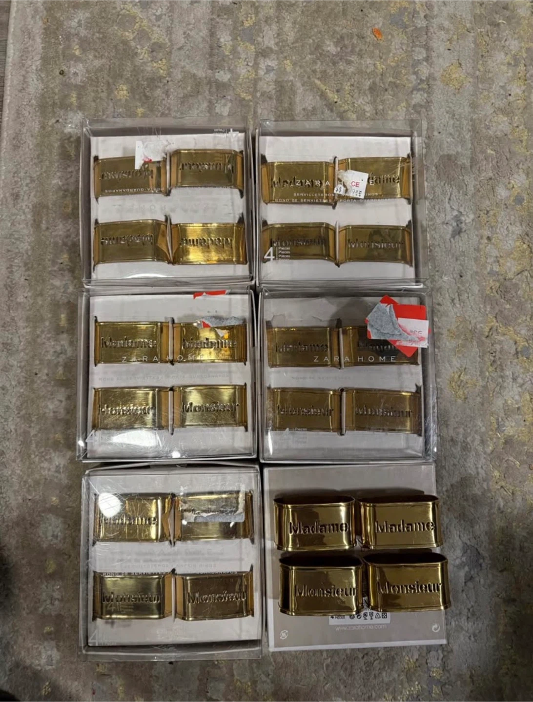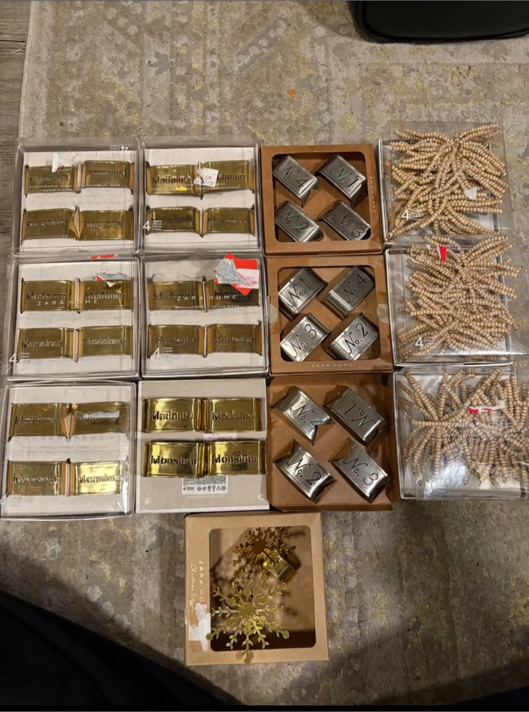 Bundle of Zara Home napkin rings and decorative beads. Includes gold-tone napkin rings with 'Madame' and 'Monsieur' inscriptions, silver-tone napkin rings numbered 1-4, and wooden bead garlands. Some items are in original packaging.