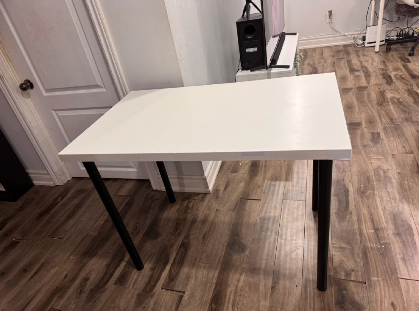 Simple white desk, black legs. Small, good for small spaces. Good condition but has some scratches along the edges of the table. Pick up Brampton. Brand ikea. 23.5 x 39 inches.