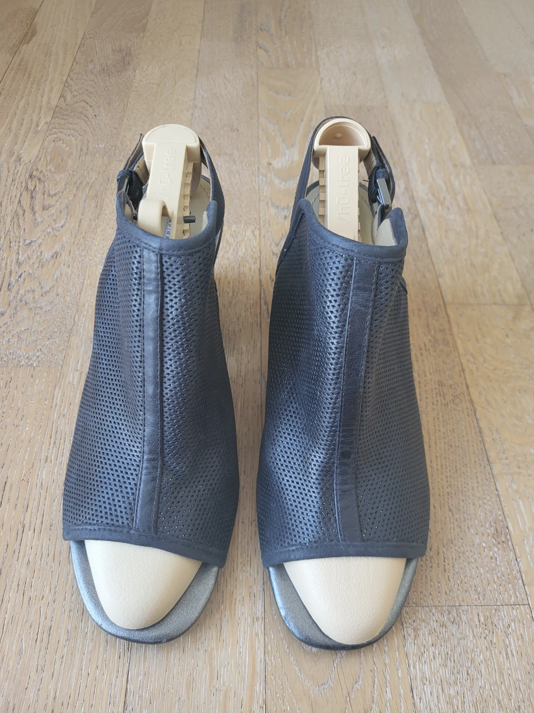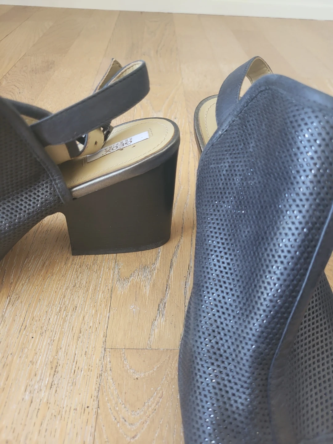 These Geox heeled sandals are a stylish black with a perforated design. They feature a comfortable block heel. Perfect for dressing up any outfit! Size 39.5