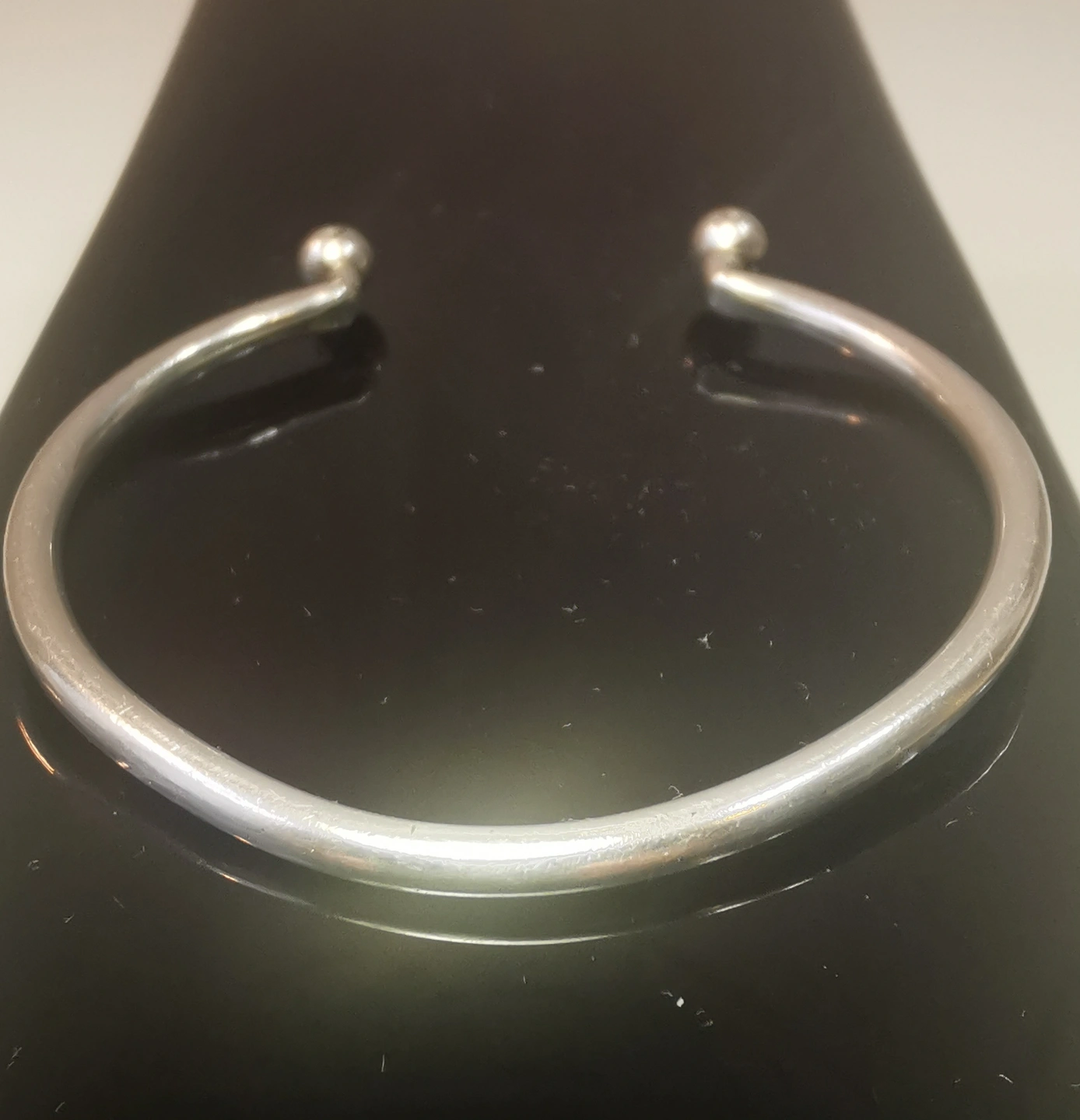 This is a classic, solid sterling silver torque-style bangle featuring polished ball terminals. Its minimalist design and 52mm internal diameter make it an ideal choice for petite wrists or as a sophisticated addition to a jewelry stack.