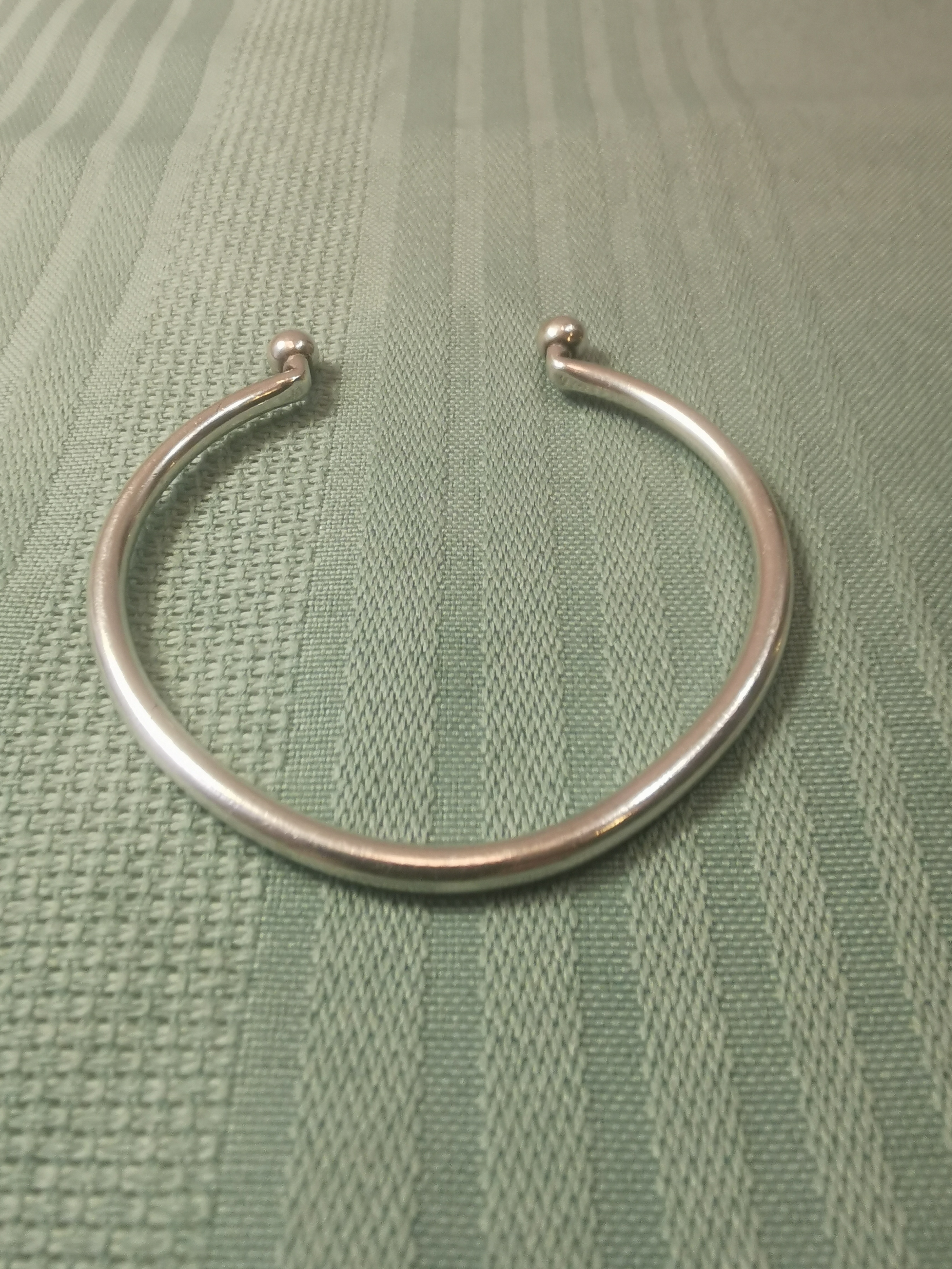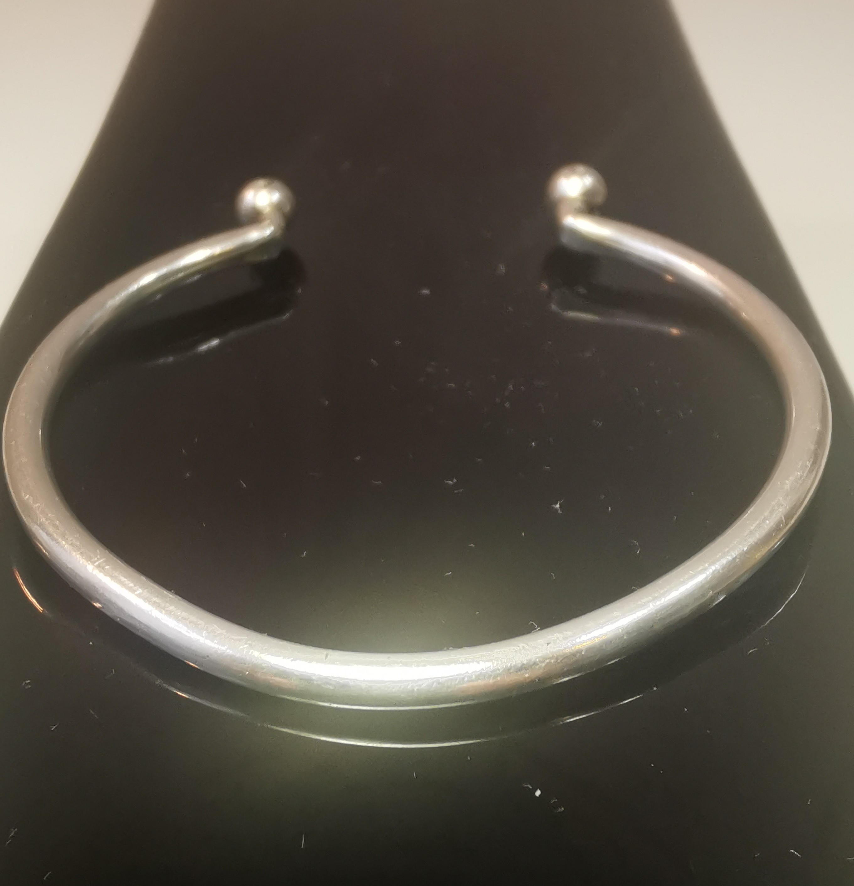 This is a classic, solid sterling silver torque-style bangle featuring polished ball terminals. Its minimalist design and 52mm internal diameter make it an ideal choice for petite wrists or as a sophisticated addition to a jewelry stack.