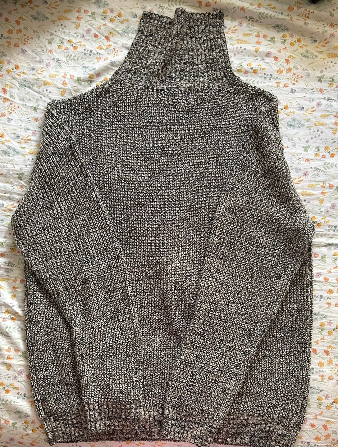 Grey and black speckled turtleneck sweater. Size XL. Long sleeves. Open shoulders. Cozy knit.