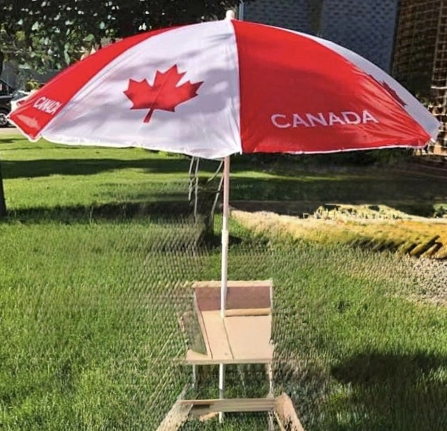 Good condition umbrella - $25. Umbrella stand - $25. Or both for $45. Show your Canadian pride at the beach with this fun Canada-themed beach umbrella! It's perfect for shading yourself from the sun while displaying your love for the maple leaf. This umbrella is in used condition and ready for a new home. It's a standard-sized beach umbrella. If the ad is up, the umbrella is available.