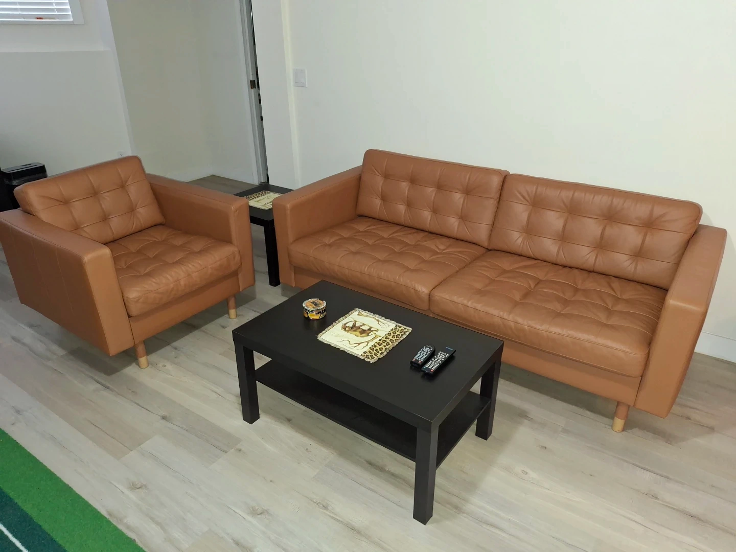 This set includes a tan leather sofa and a matching armchair. Both pieces feature a stylish tufted design and comfortable seating. The furniture has wooden legs for support. Both in great condition and cared for with leather conditioner