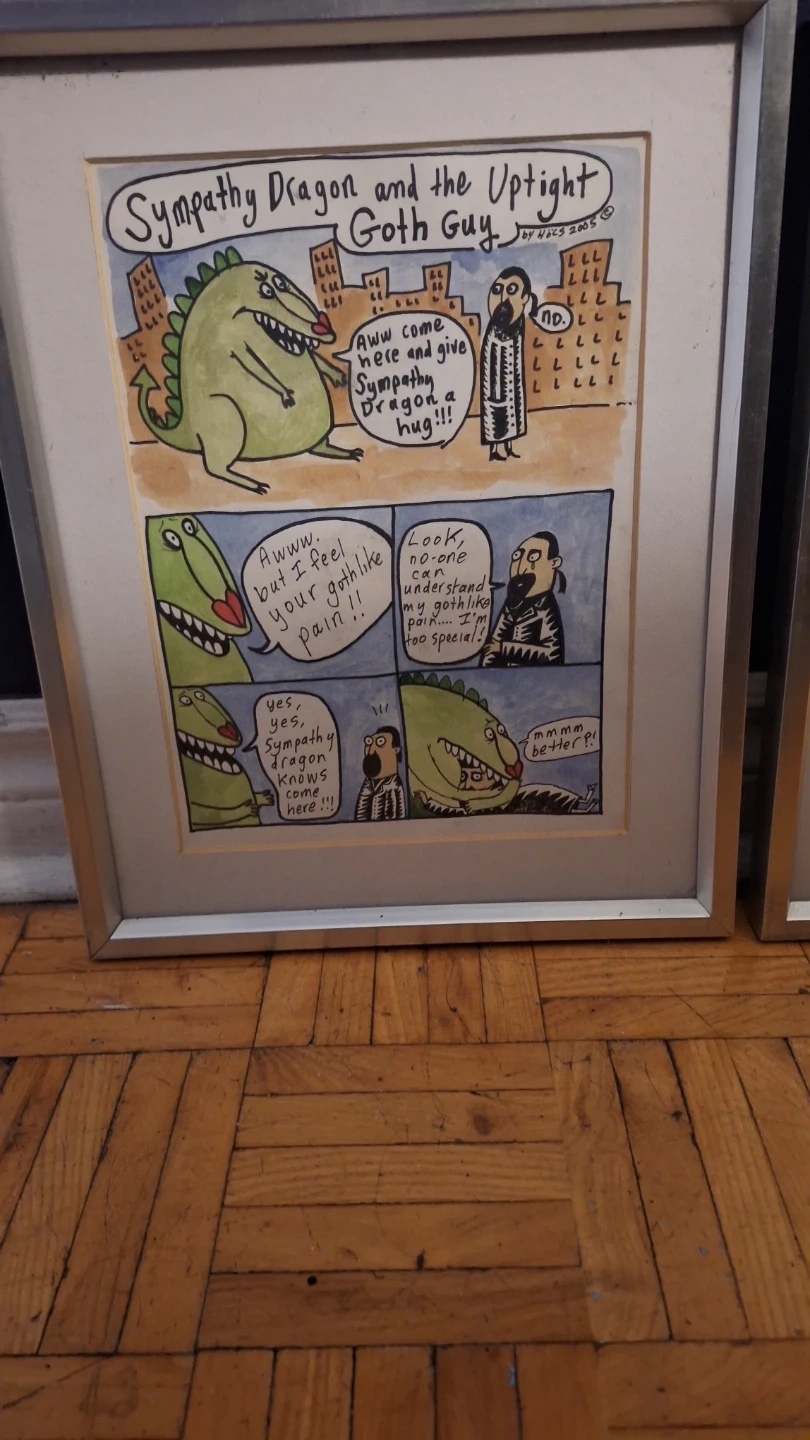 Collection of three framed art prints titled "A Sluggish Economy", "Sympathy Dragon and the Uptight Goth Guy", and "In the Land Where Nothing Was Said". Dated 2006 and created by Hocs. These unique watercolour pieces offer a blend of humour and social commentary.