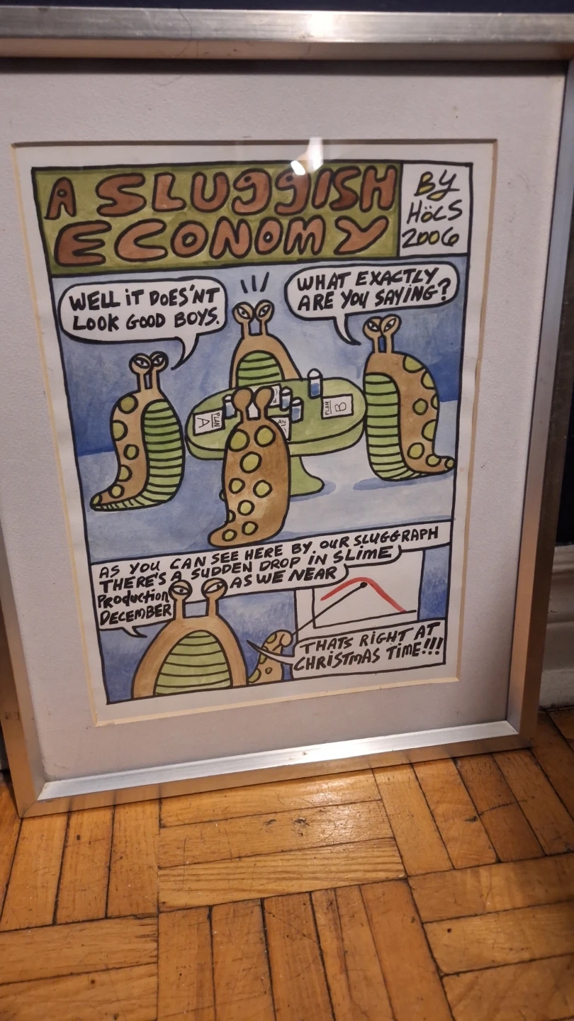 Collection of three framed art prints titled "A Sluggish Economy", "Sympathy Dragon and the Uptight Goth Guy", and "In the Land Where Nothing Was Said". Dated 2006 and created by Hocs. These unique watercolour pieces offer a blend of humour and social commentary.