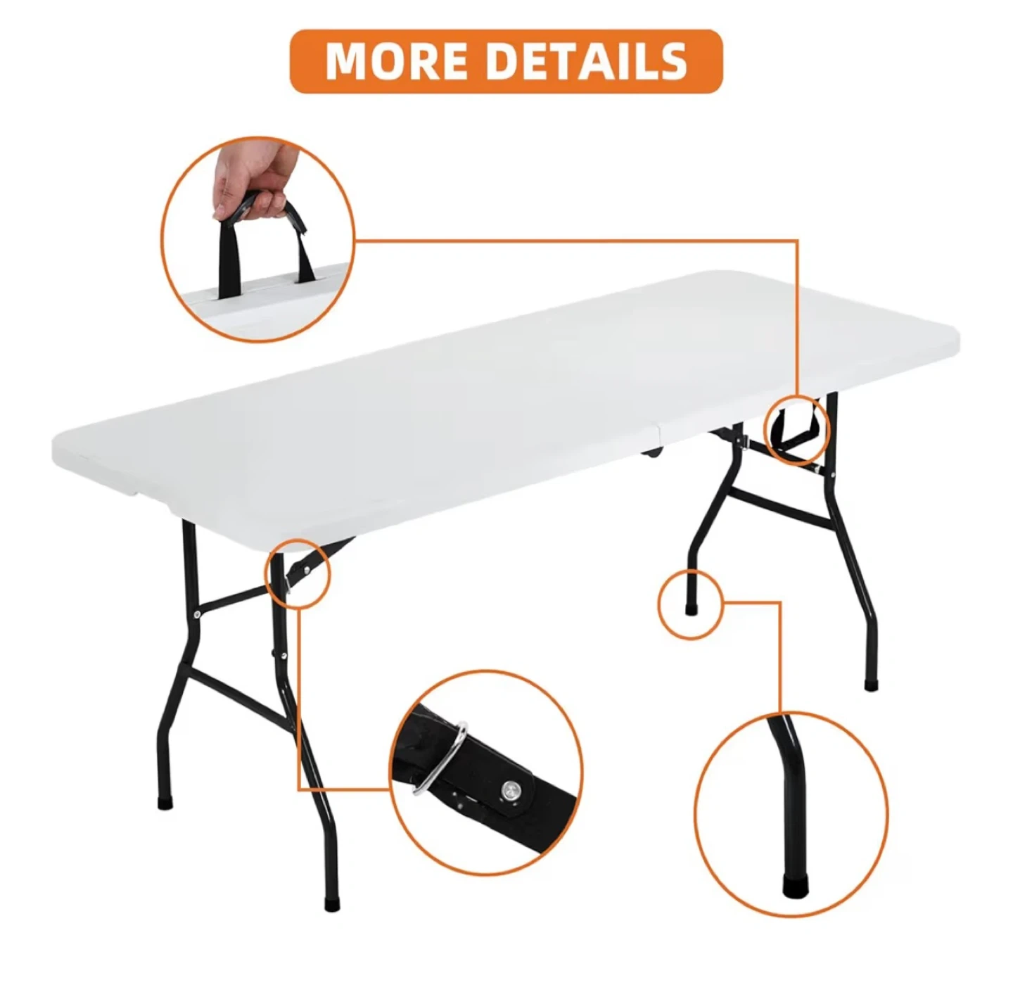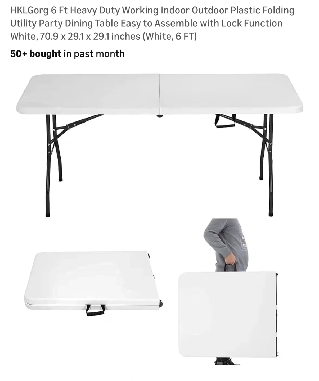 This is a HKLGorg 6 ft heavy duty folding utility table. It's made of white plastic and has a lock function. Dimensions are 70.9 x 29.1 inches when open, and it folds to 29.1 inches in height and 2.8 inches in depth.