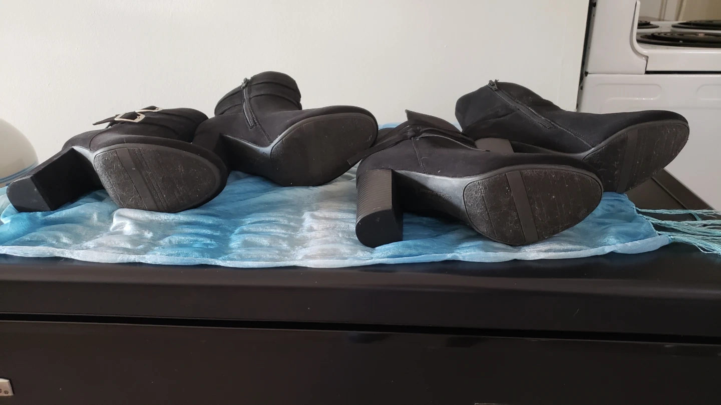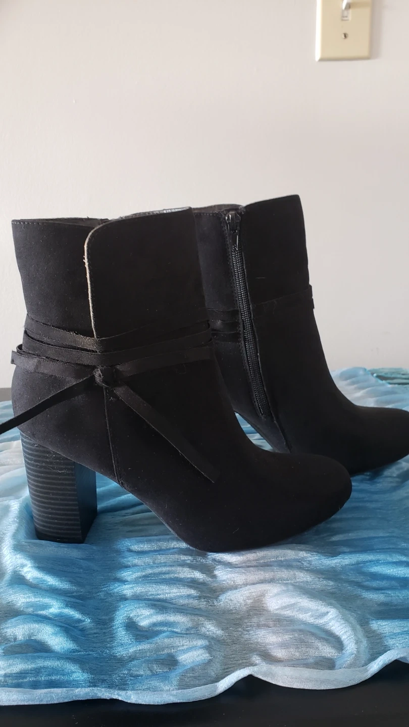 Beautiful and sexy black faux suede ankle boots. Worn once or twice each so in excellent condition, no scuffs or marks. Boots with silver toned buckles are size 8.5 but fit more like a 7.5/8, approx 3 inch chunk heel. Boots with ribbon detail are size 8 but fit like a 7.5/8, also approx 3 inch chunk heel. Both very comfortable and the chunk heel is easier on the knees, and great ankle support. $40 for each pair, or buy both for $70. These are really nice boots!
