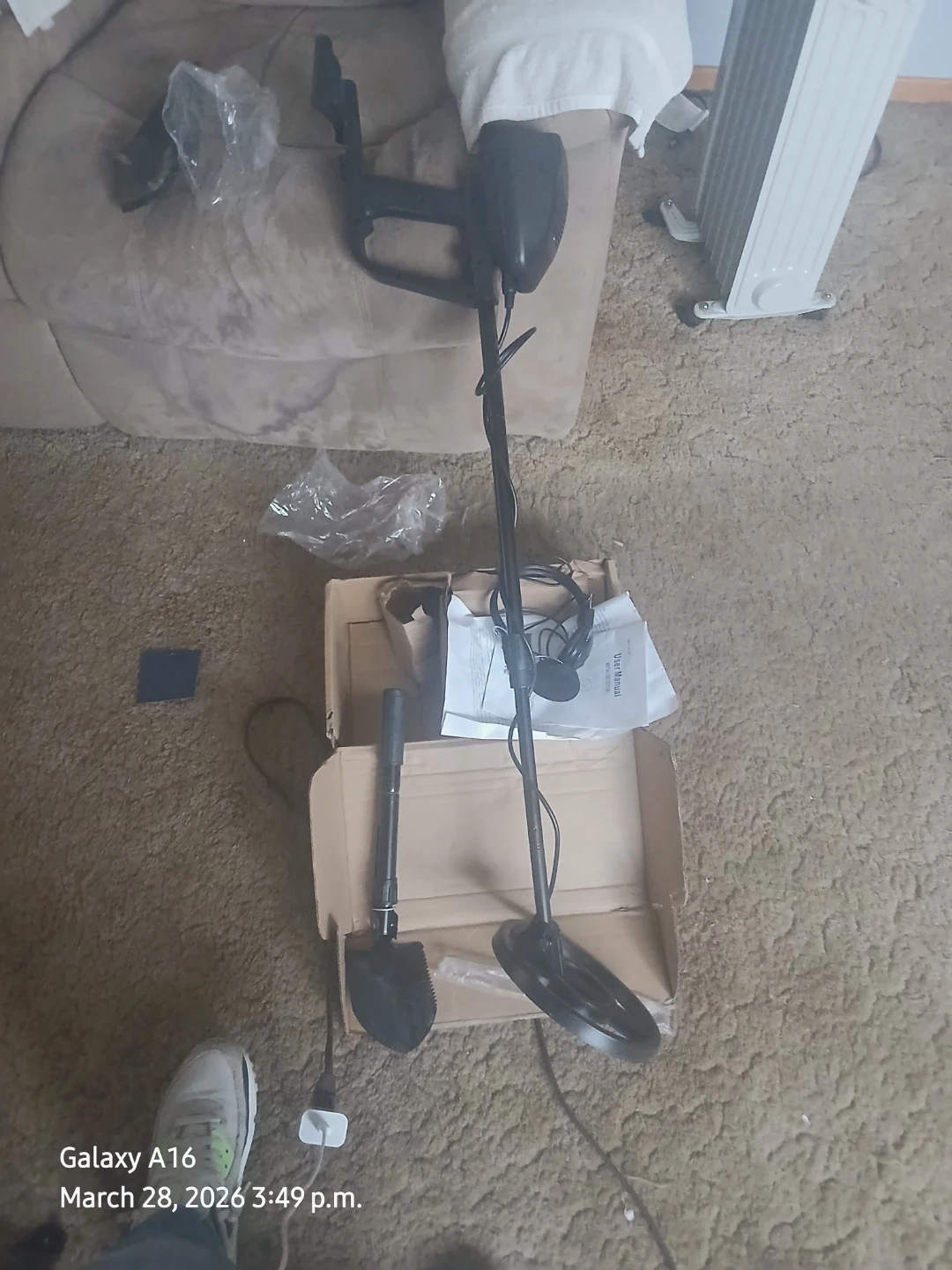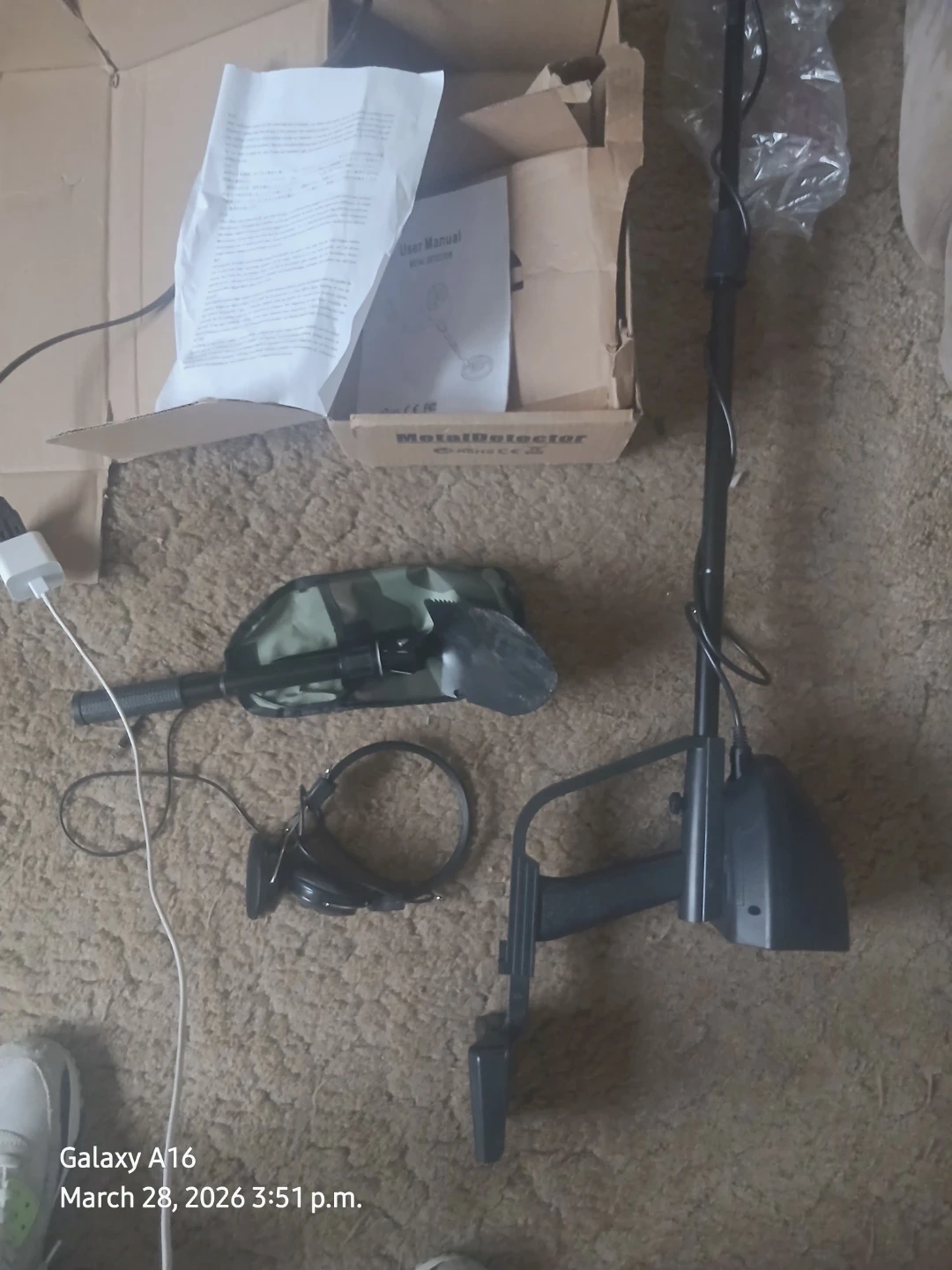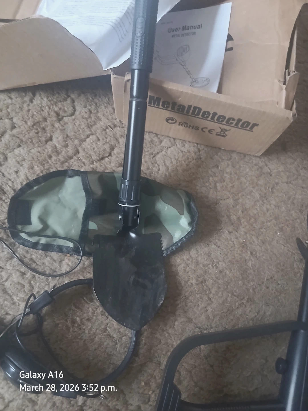 It's a metal detector with a collapsible shovel and headphones. The user manual is included. This detector is suitable for finding buried treasures!