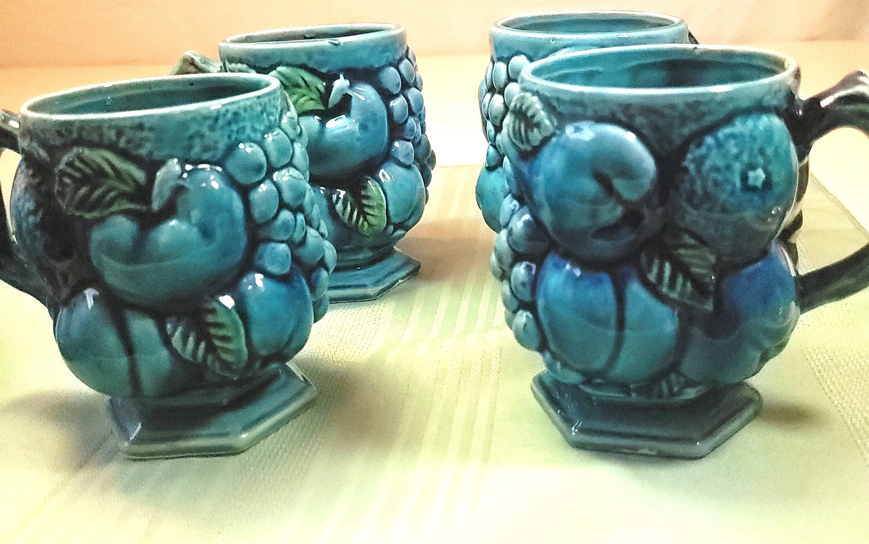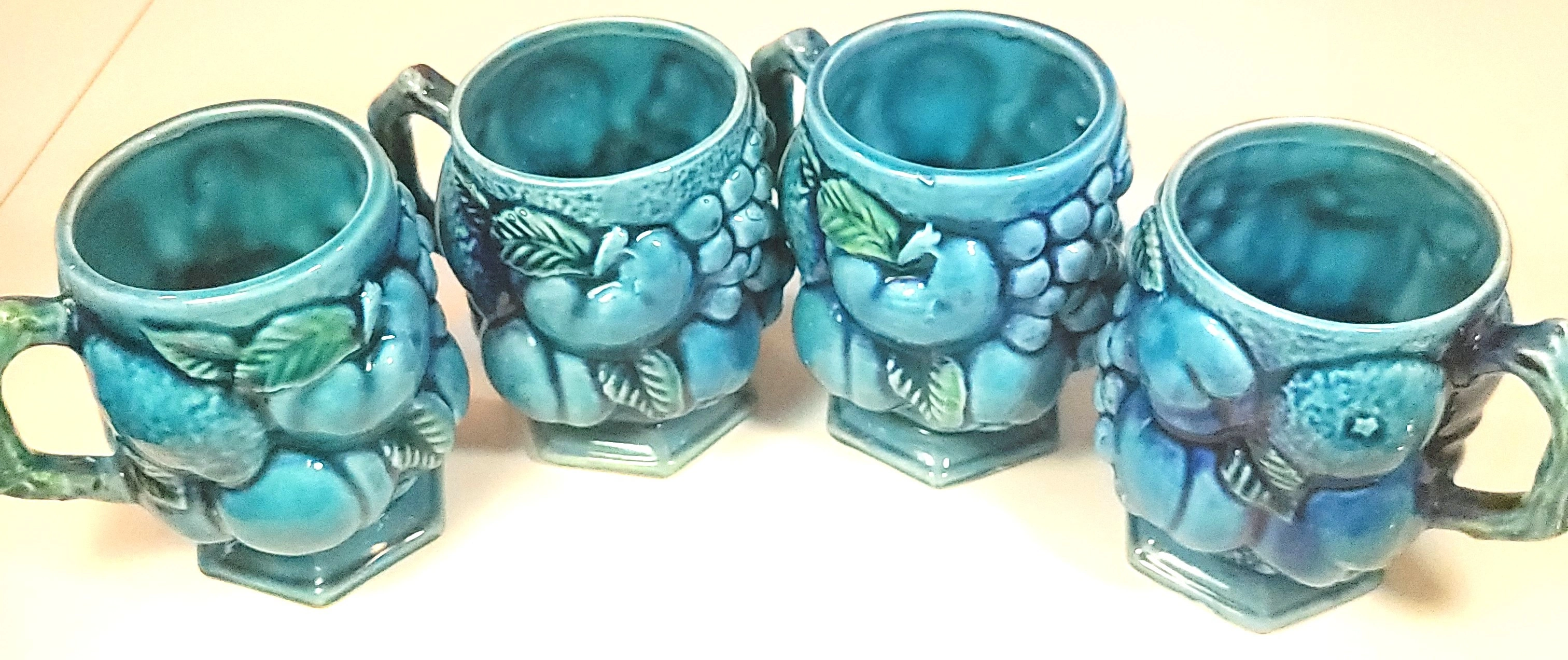 Elevate your home with this authentic, mid-century set of four "Mood Indigo" mugs by Inarco, Japan. Renowned for their vibrant, high-gloss indigo blue glaze and intricately detailed, raised fruit-and-leaf relief pattern, these mugs are a classic example of 1960s Japanese ceramic export design. Each mug is marked with the iconic Inarco "G" in a wreath and model number E2431. Perfect for collectors of MCM (Mid-Century Modern) decor or anyone looking to add a touch of vintage character to their kitchen.