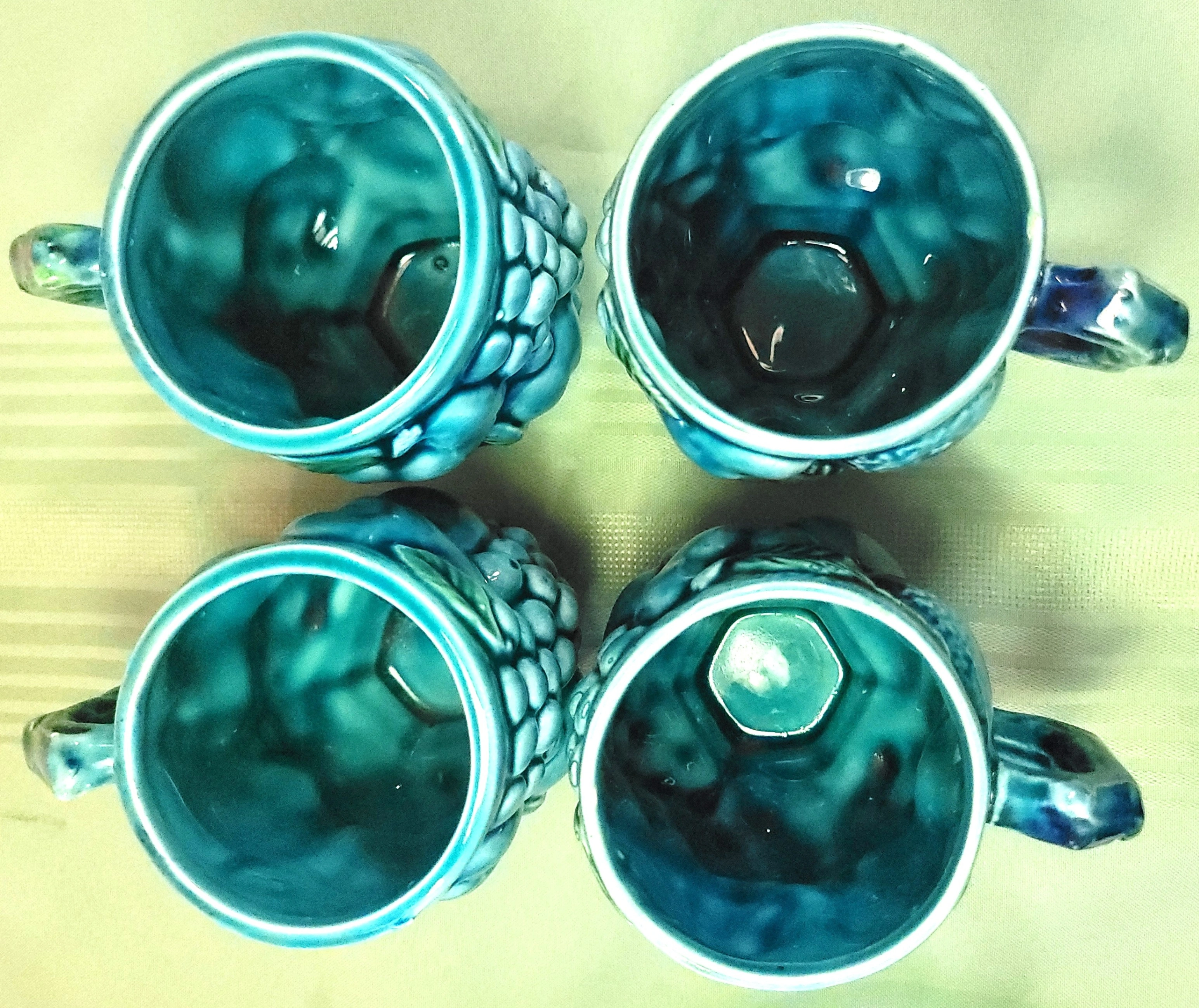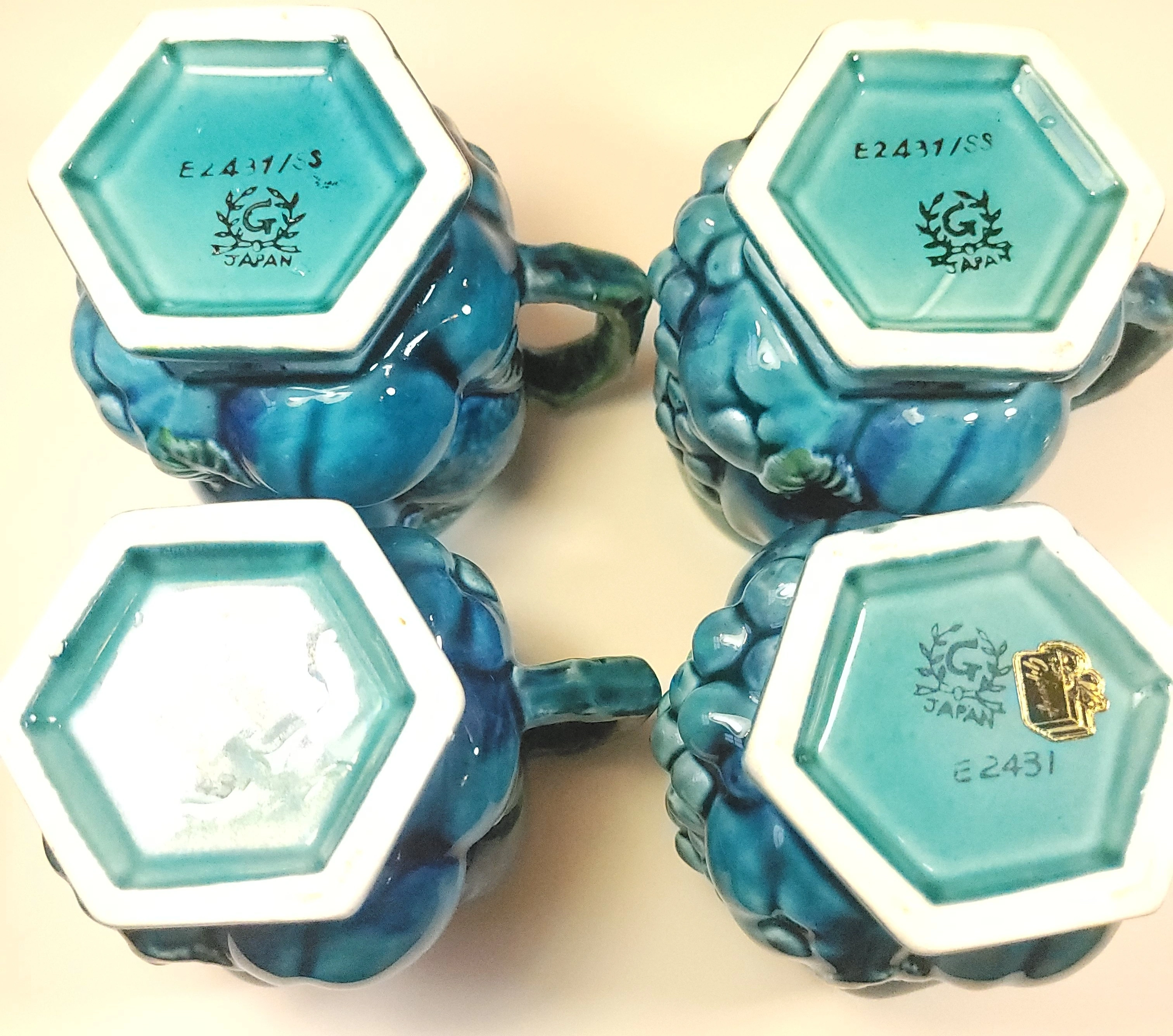 Vintage 1960s Inarco "Mood Indigo" Ceramic Mugs | E2431 Japan | Set of 4 Embossed Blue Fruit Mugs | Mid-Century Modern Kitchenware