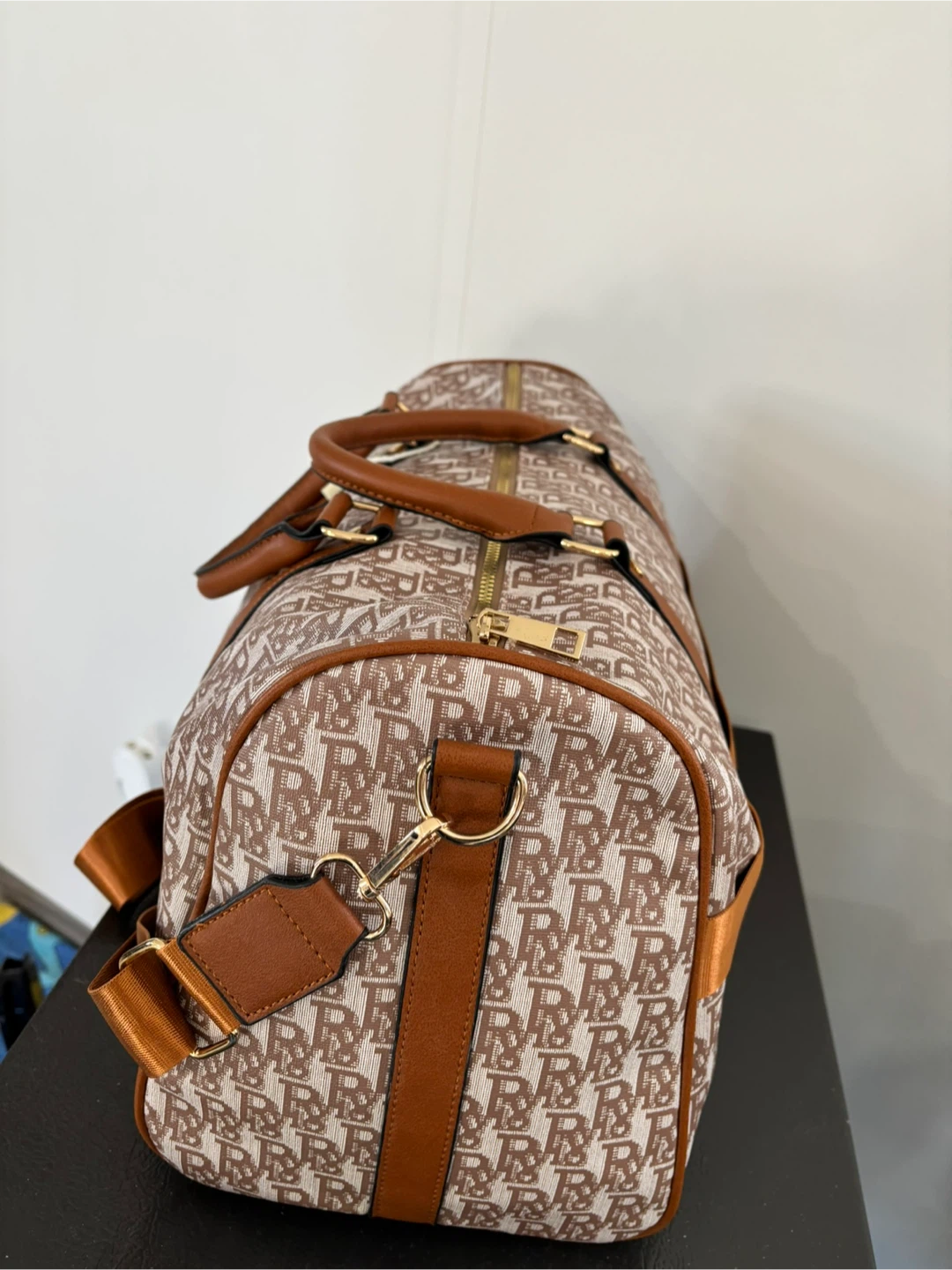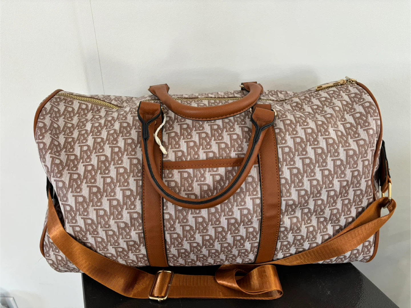 This duffel bag features a repeating monogram pattern in brown and tan. It's made with a durable canvas-like material and accented with faux leather trim and handles. Comes with an adjustable shoulder strap for versatile carrying. It's a great size for weekend trips!