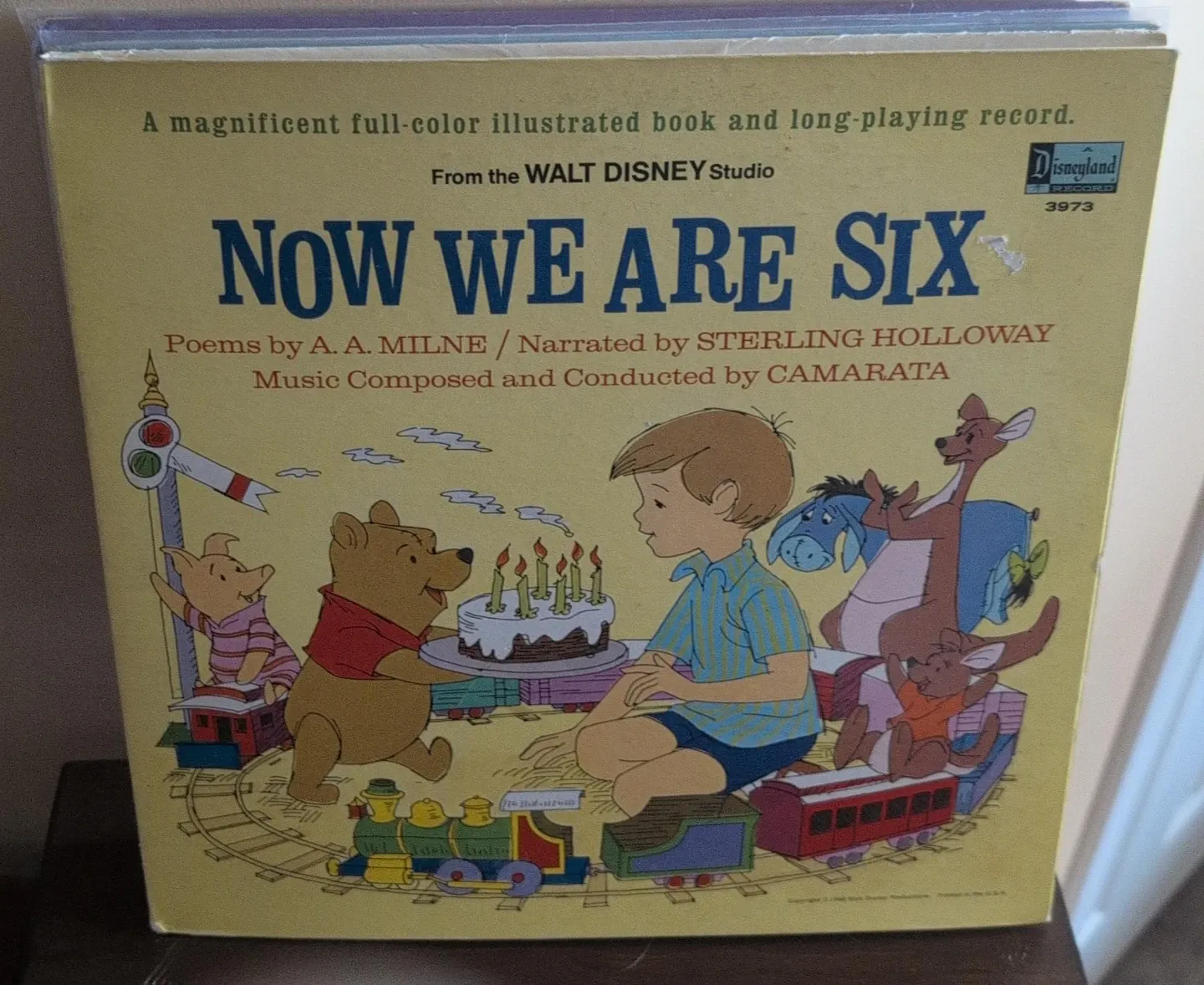 This is a "Now We Are Six" illustrated book and long-playing record from the Walt Disney Studio. It features poems of Winnie the Pooh by A. A. Milne, narrated by Sterling Holloway, with music composed and conducted by Camarata. This classic collection is great for young children.