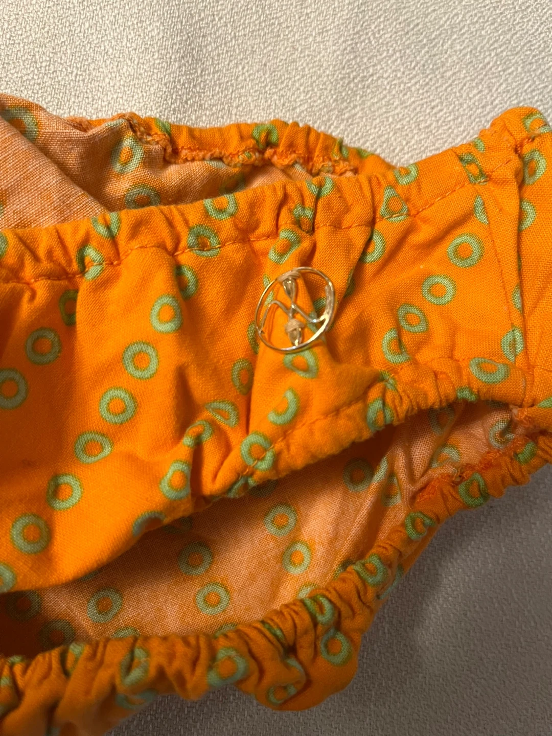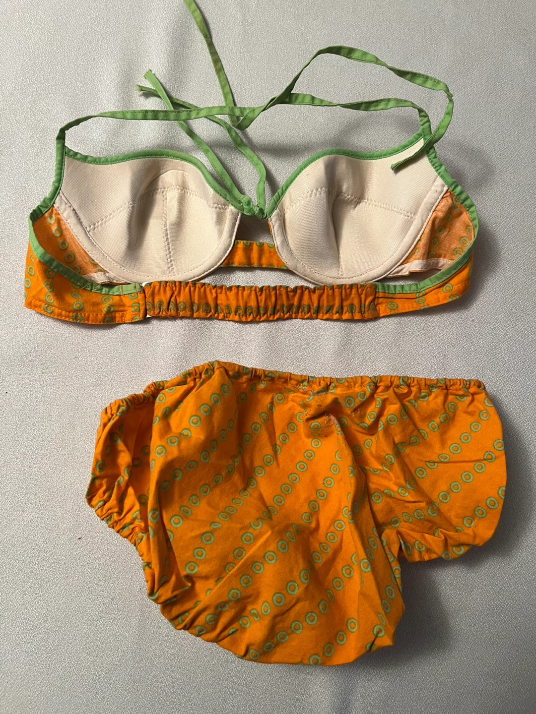This 1960’s Rare Find in immaculate condition- ORCHIDEE bikini made in Western Germany Bright orange swim set with green trim and circular print. Soft, comfortable 100% cotton fabric . Features secure straps, lined bustier and bottom and elasticized bottoms for a snug fit. Color: orange with green accents.