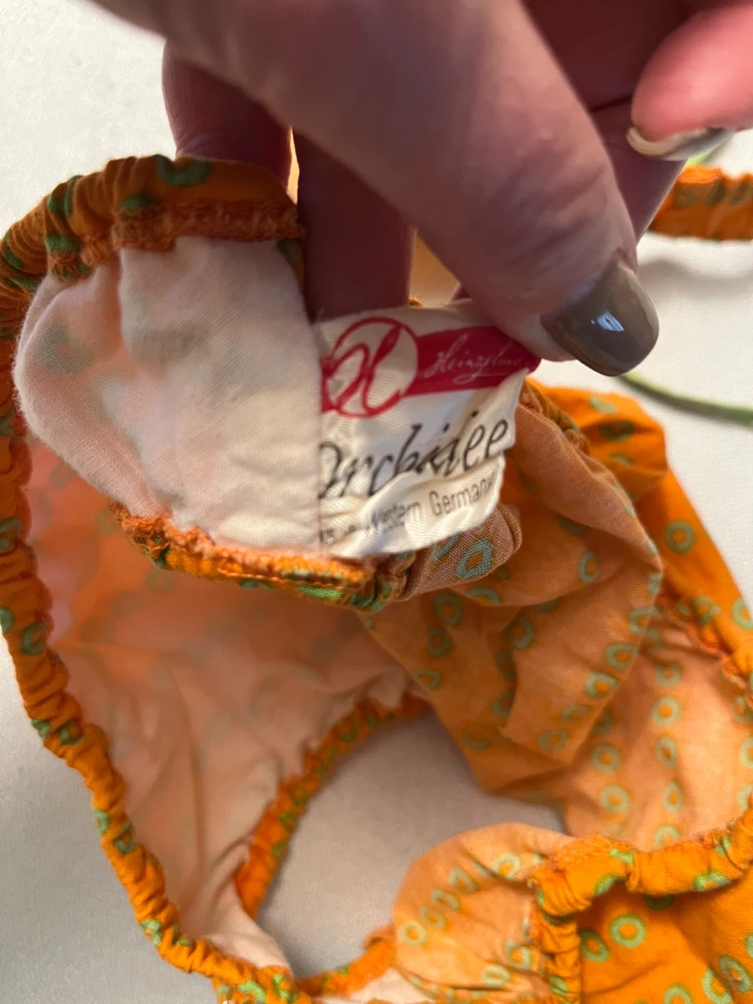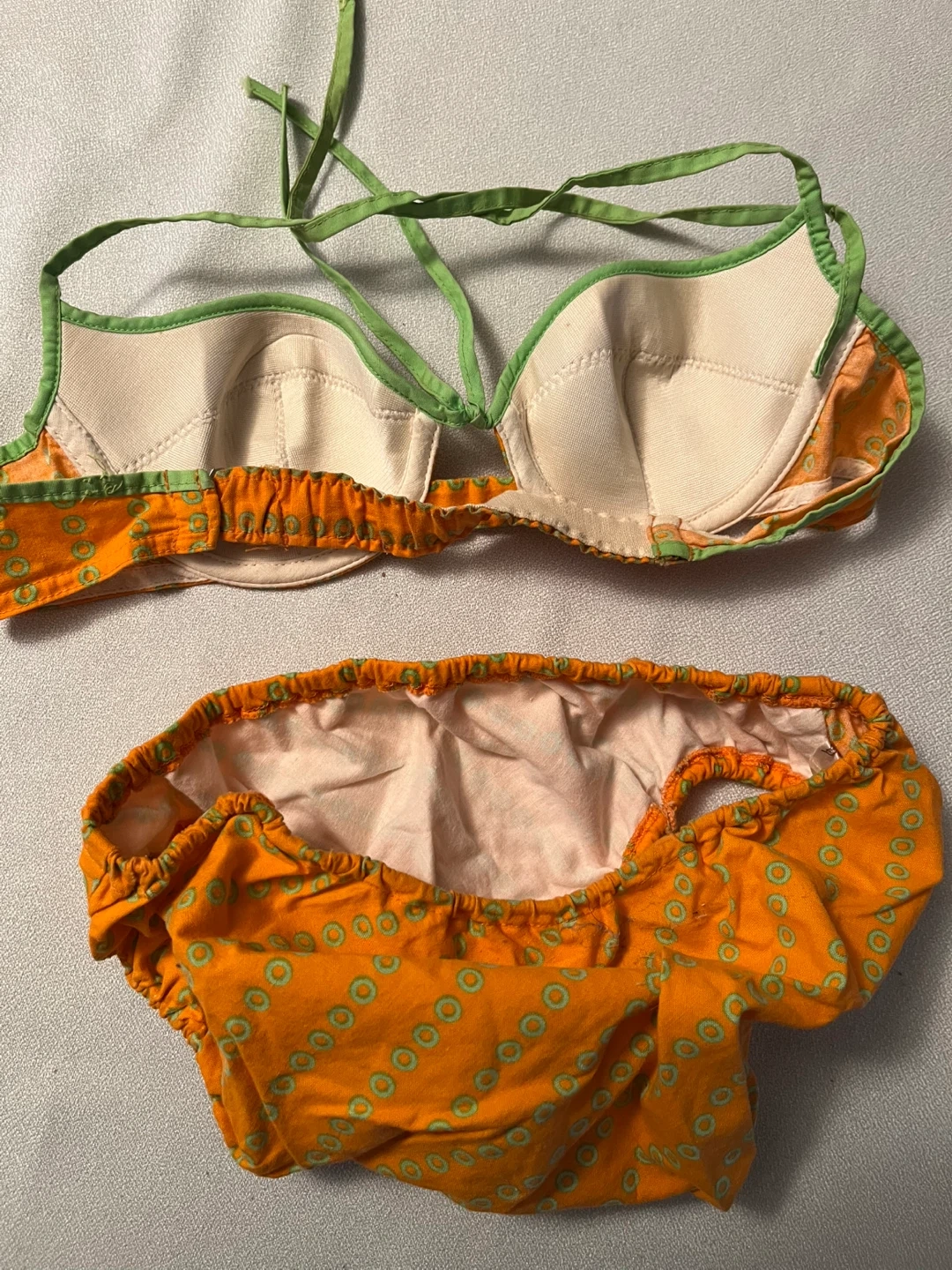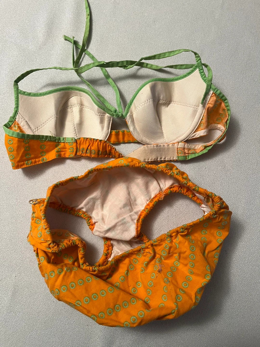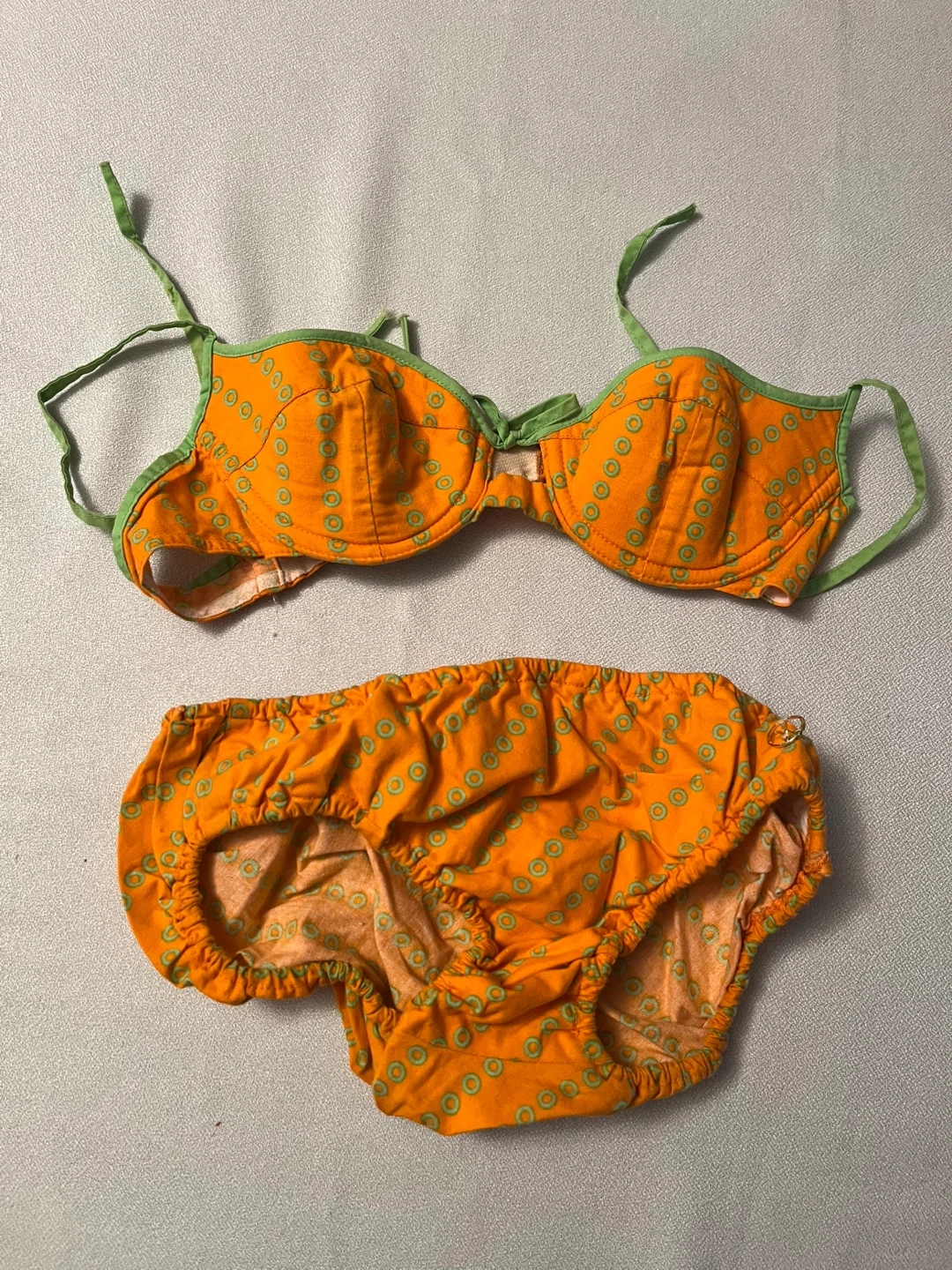This 1960’s Rare Find in immaculate condition- ORCHIDEE bikini made in Western Germany Bright orange swim set with green trim and circular print. Soft, comfortable 100% cotton fabric . Features secure straps, lined bustier and bottom and elasticized bottoms for a snug fit. Color: orange with green accents.