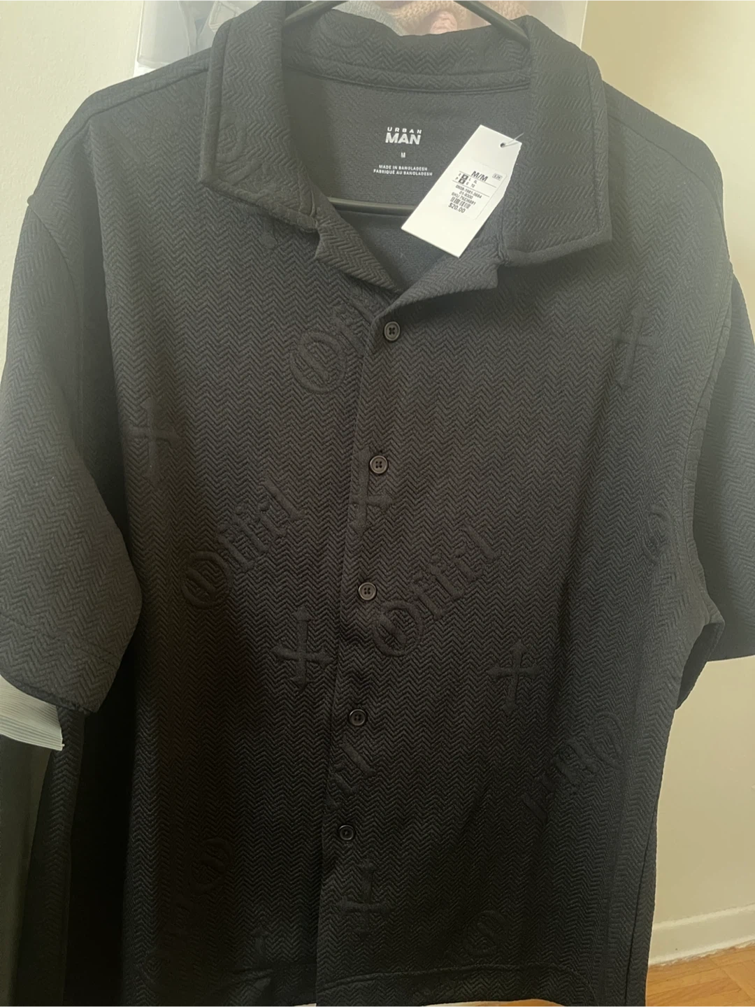 URBAN MAN black textured short sleeve button-up shirt. Size medium. Made in Bangladesh. This shirt has a unique embossed pattern all over.