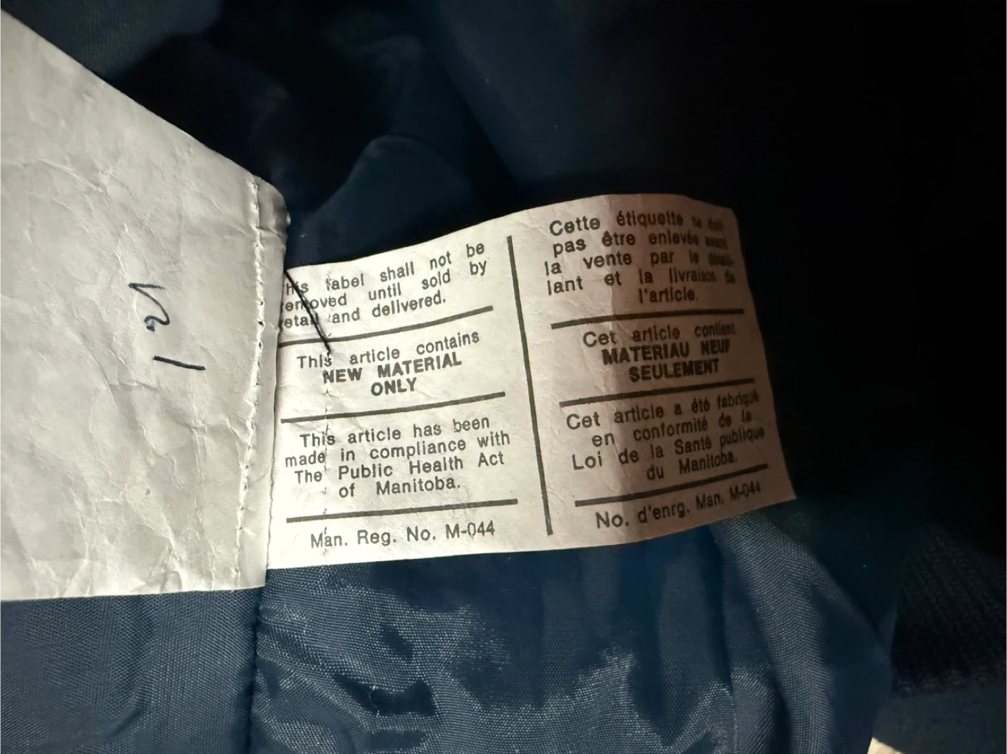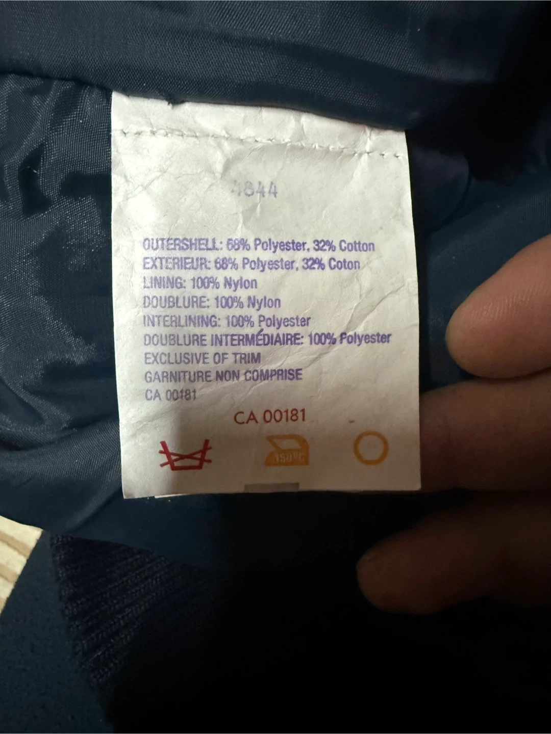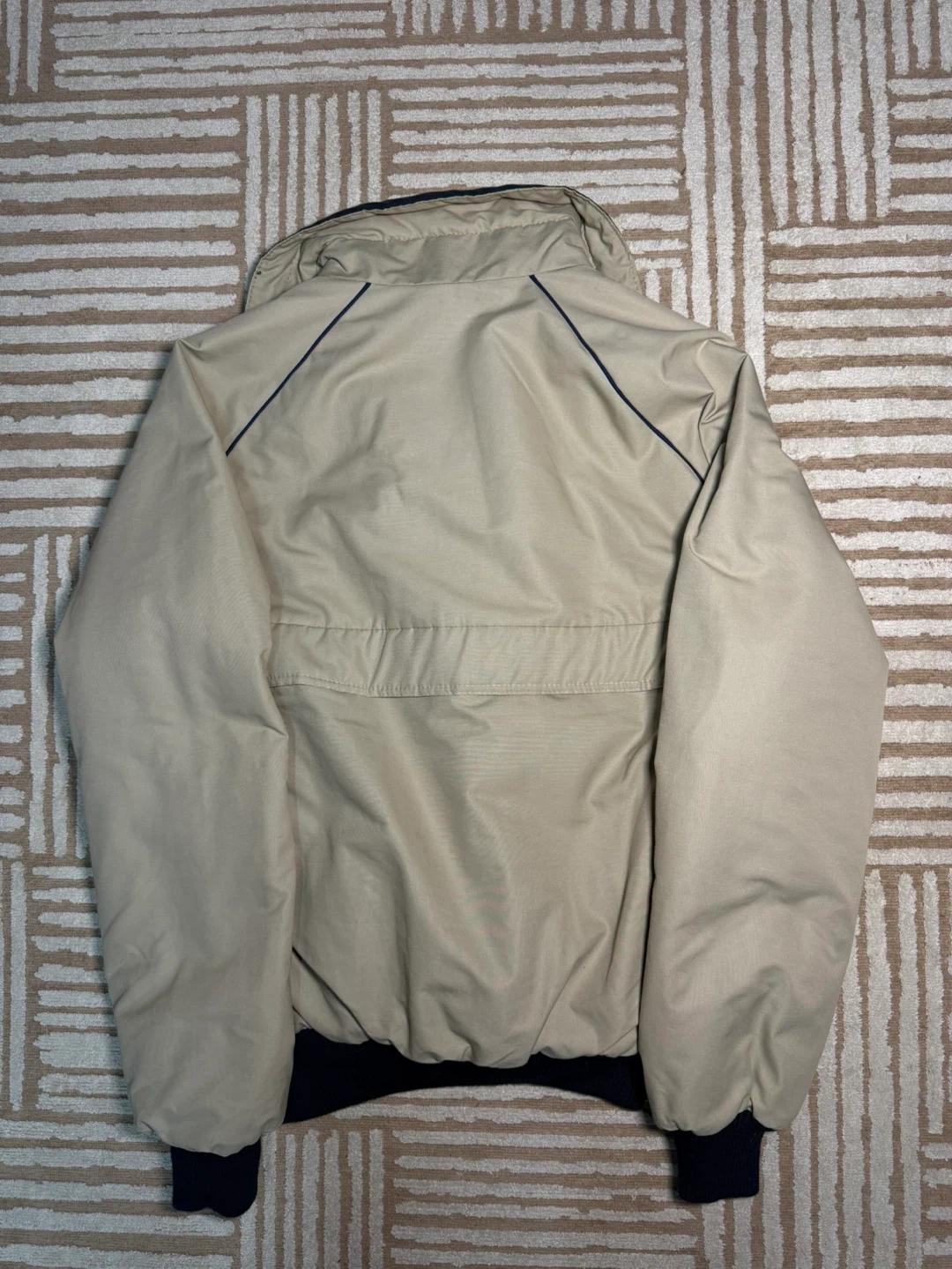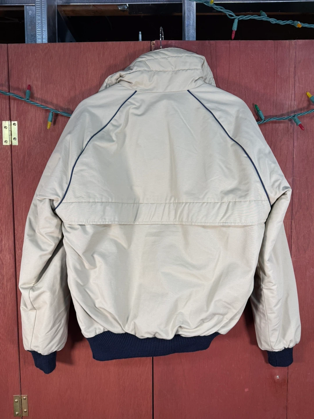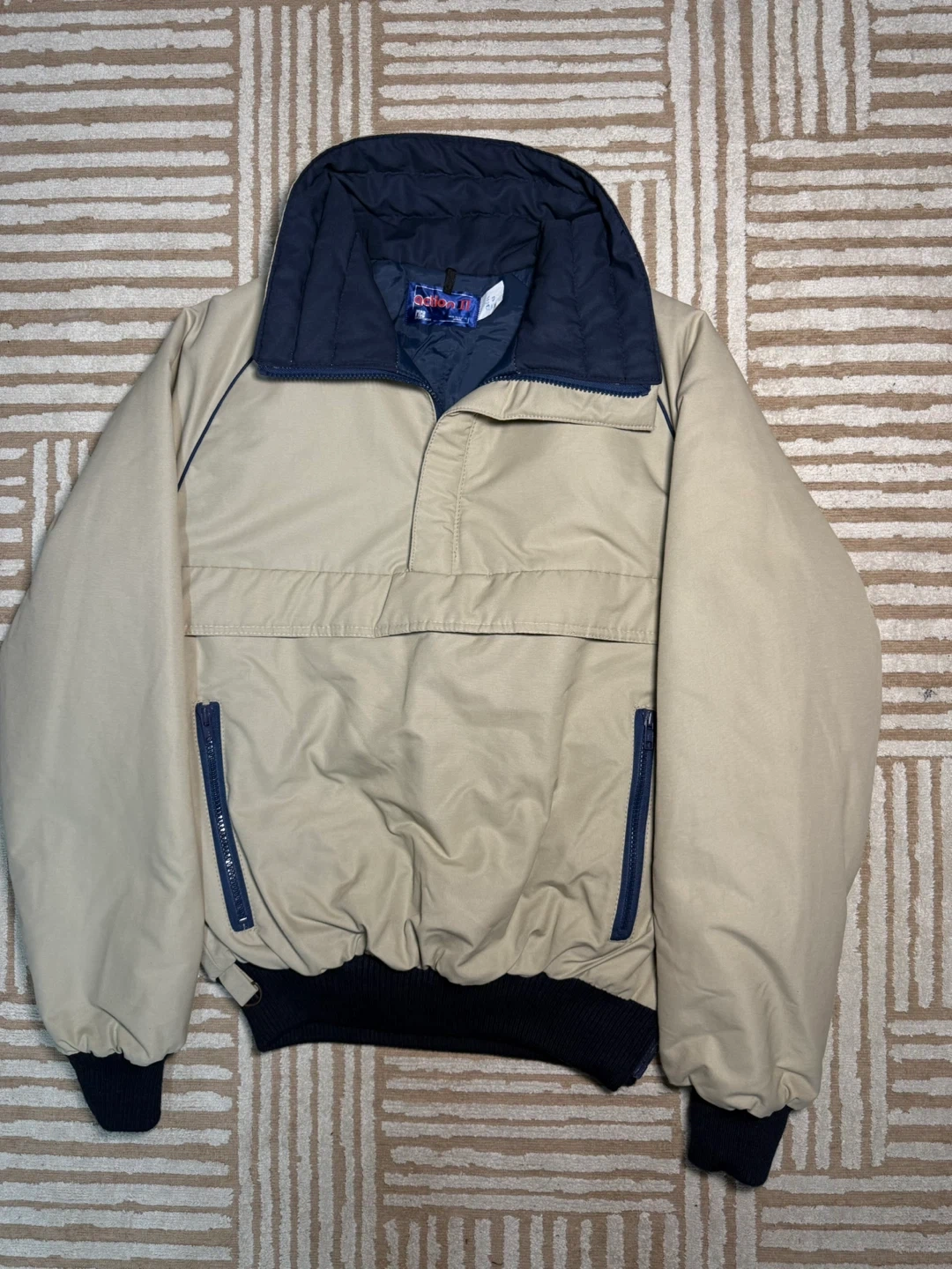 Cozy and durable puffer jacket. Beige body with dark blue accents. Ideal for outdoor activities.