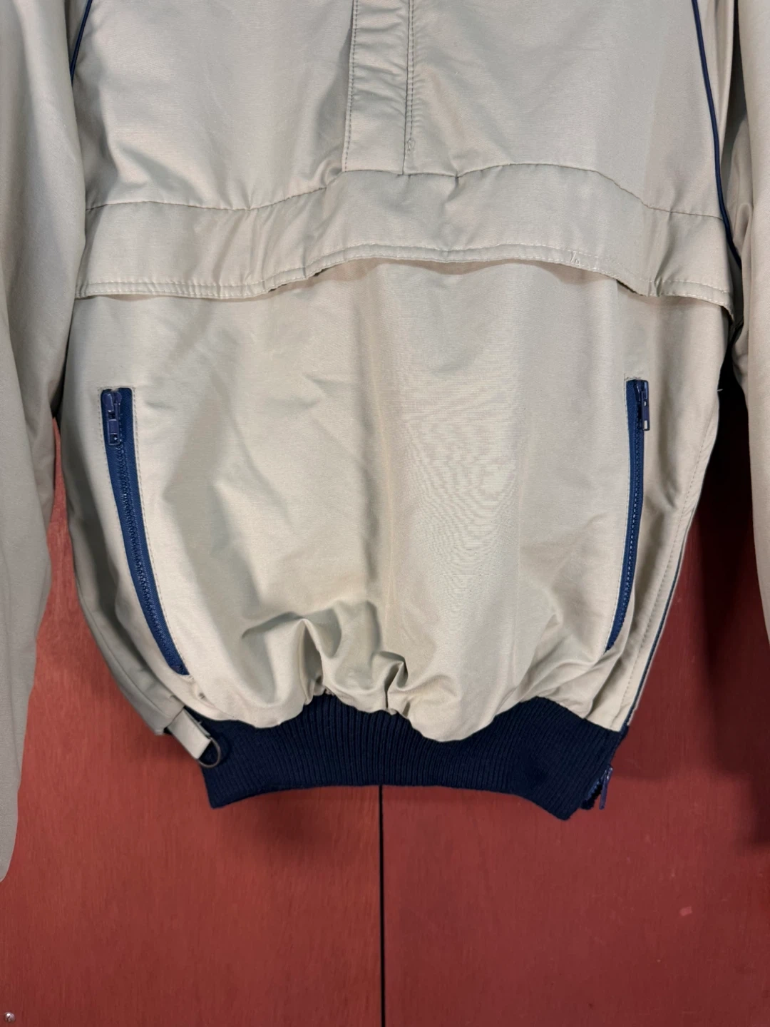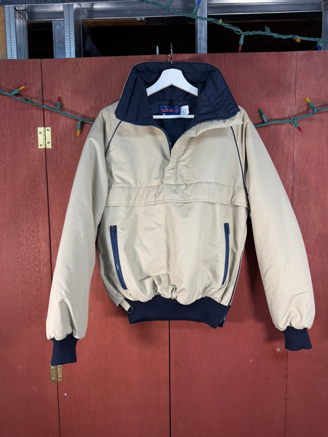 Action II Rice Sportswear pullover jacket in beige with navy accents. It features a quarter-zip closure.