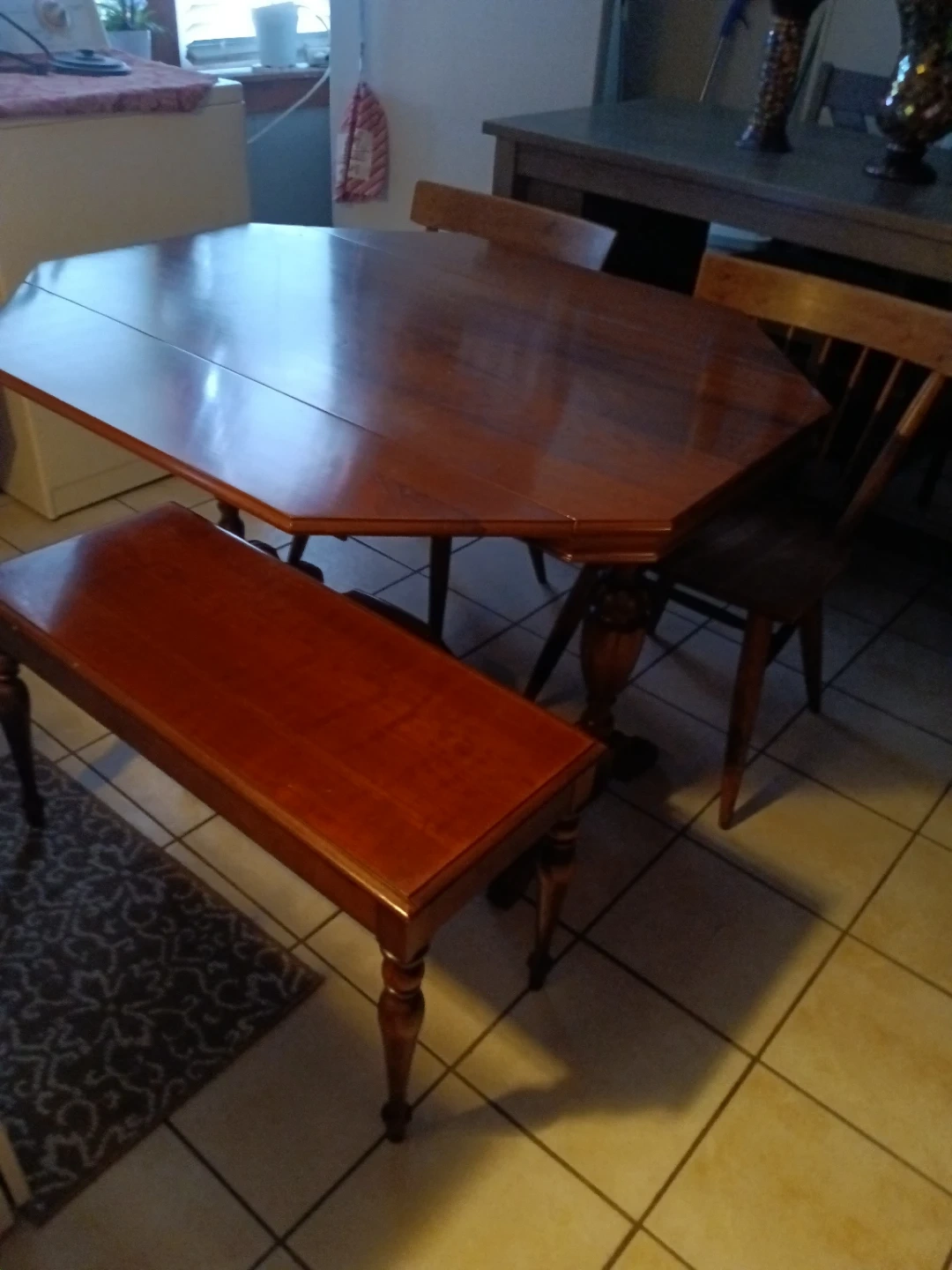 A classic wooden dining table set. It includes a table with a leaf for expansion and four chairs. The set also comes with a matching bench. It's perfect for family meals or gatherings!