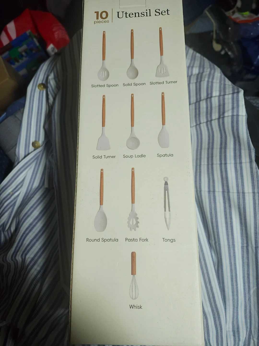 This is a 10-piece utensil set. It includes slotted spoons, solid spoons, slotted turners, spatulas, a soup ladle, and tongs. The utensils have wooden handles and a silicone finish. Perfect for everyday kitchen tasks!