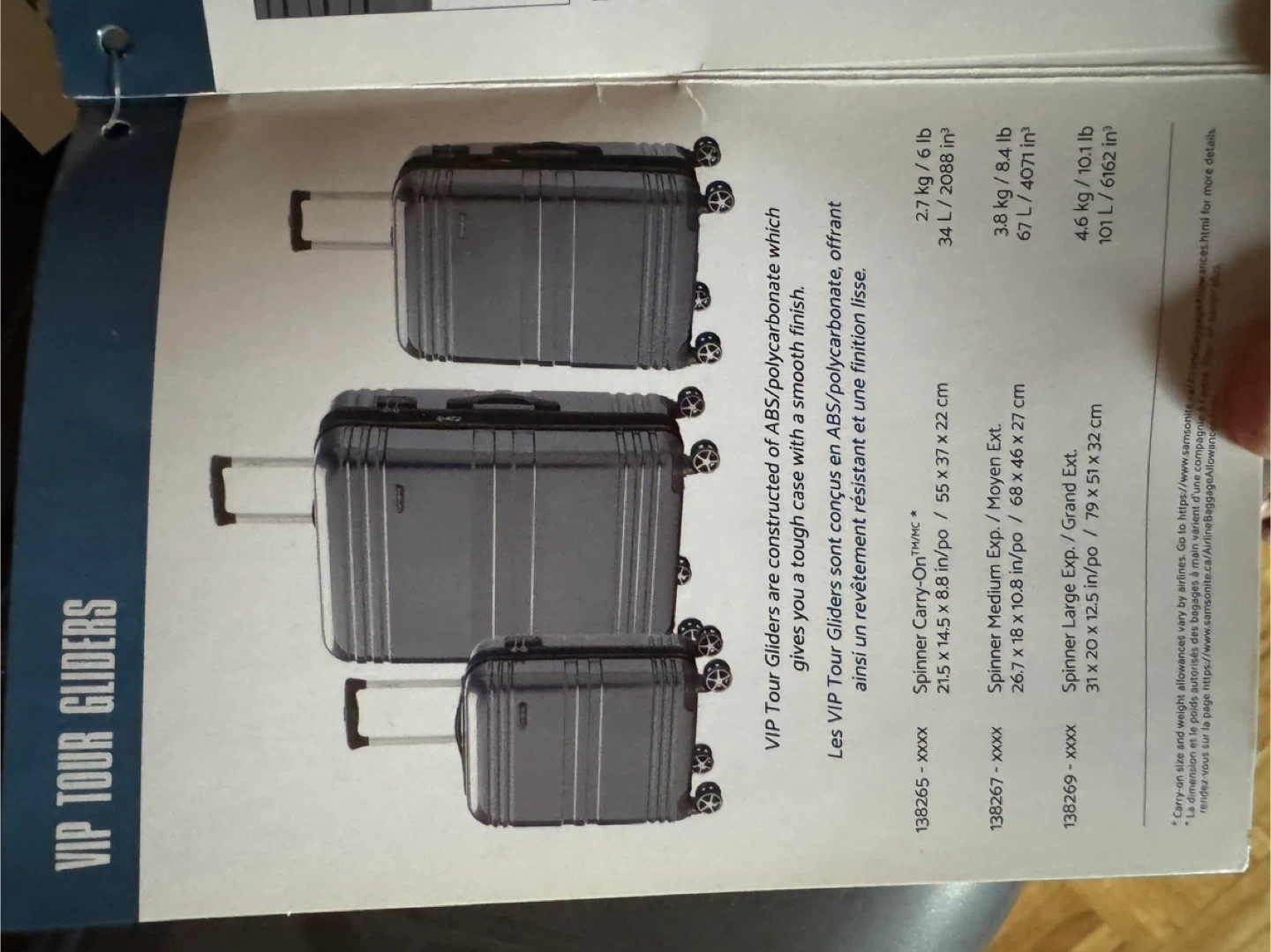 Samsonite spinner carry-on luggage. constructed of ABS/polycarbonate. Spinner carry-on dimensions are 21.5 x 14.5 x 8.8 inches. TSA lock included. Grey and red. Sold together or separately. Price is for each one